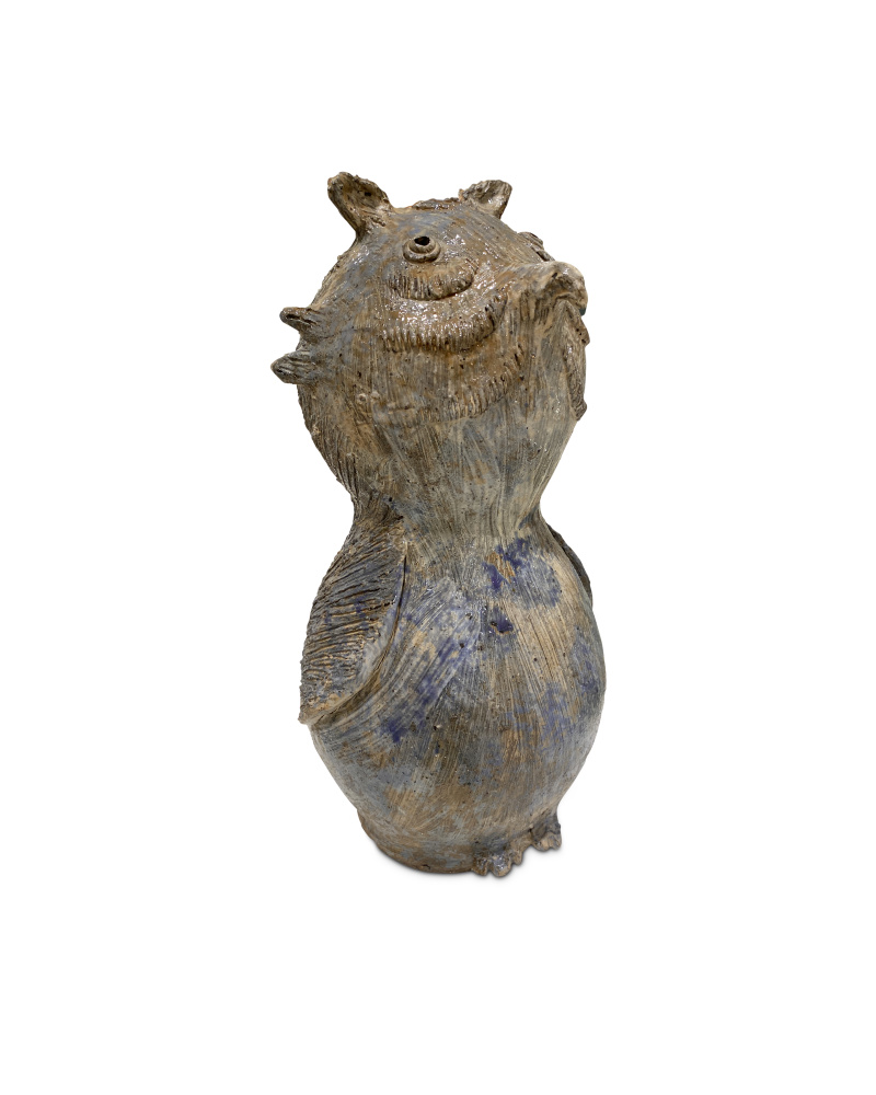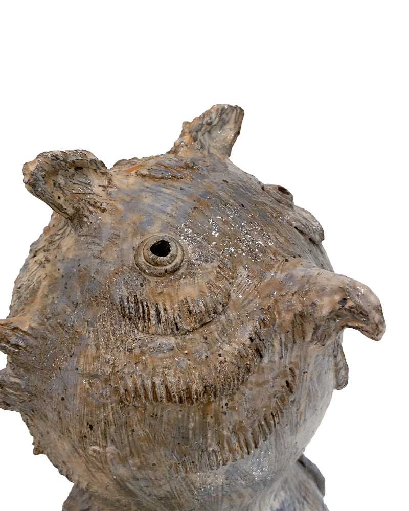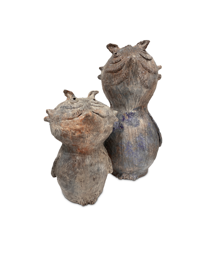 The Large Hoot Owl was created by Thai artist Arjan Deng, who is known for his one-of-a-kind ceramic statues of emotionally evocative characters. This is his interpretation of the wise animal, made of terracotta that is splattered with a reactive glaze to bring the sculpture a sizable dose of texture and character.