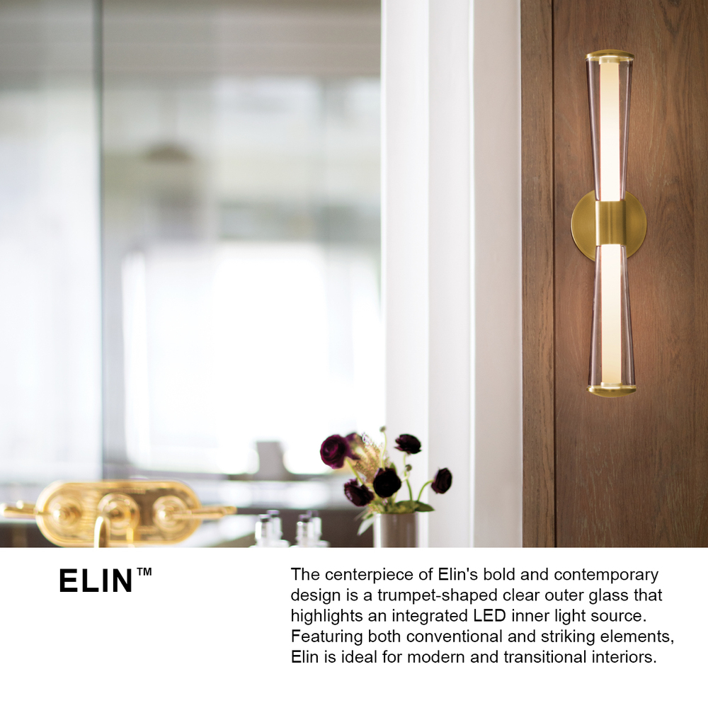 The centerpiece of Elin's bold and contemporary design is a trumpet-shaped clear outer glass that highlights an integrated LED inner light source. Featuring both conventional and striking elements, Elin is ideal for modern and transitional interiors and available in Black or Lacquered Brass finish options.