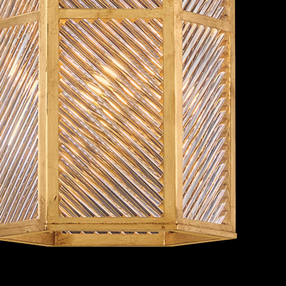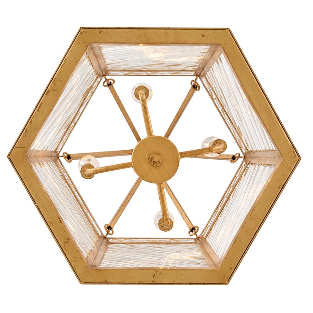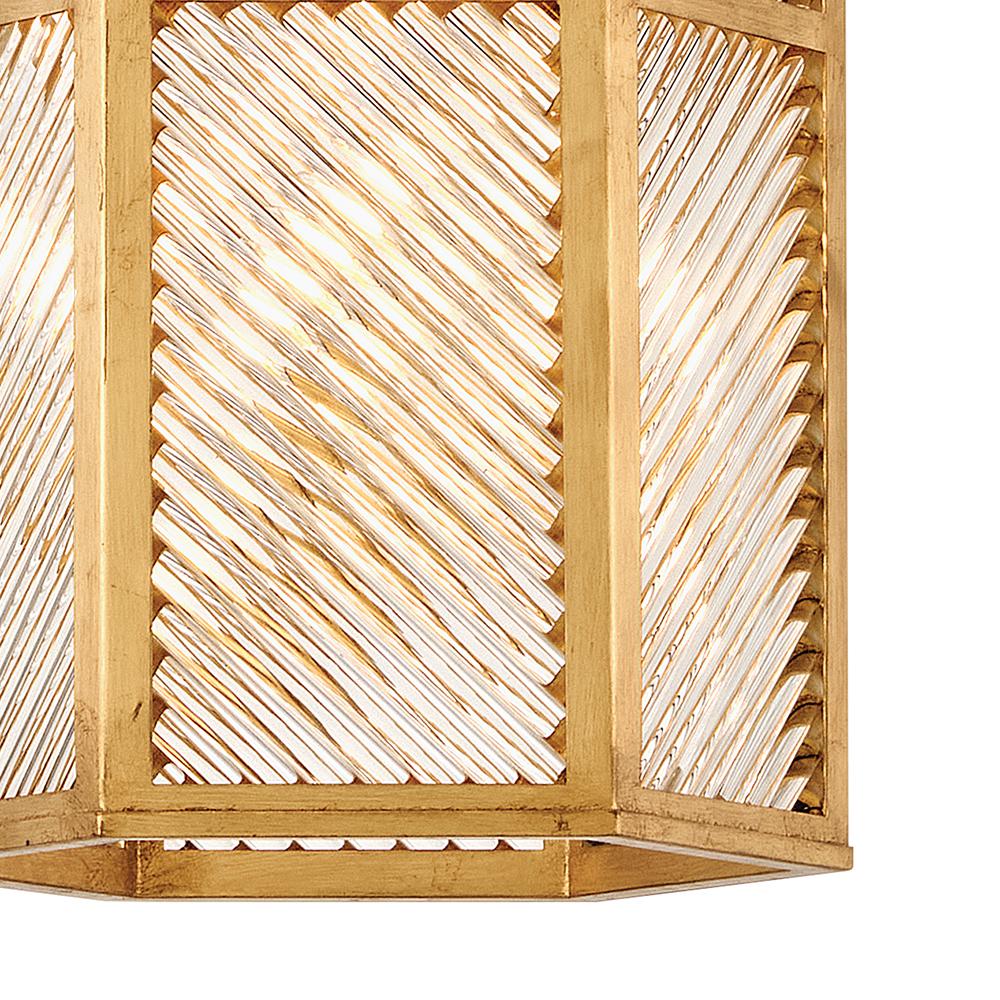 A reimagining of vintage designs from the 40s and 50s, Sura’s transitional, hexagonal Distressed Brass frame creates a glamorous yet understated and tailored appeal. Cylindrical glass rods set at alternating angles echo a soft herringbone pattern, juxtaposing geometry within geometry. Layered details create a reeded effect that is reflective and alluring.