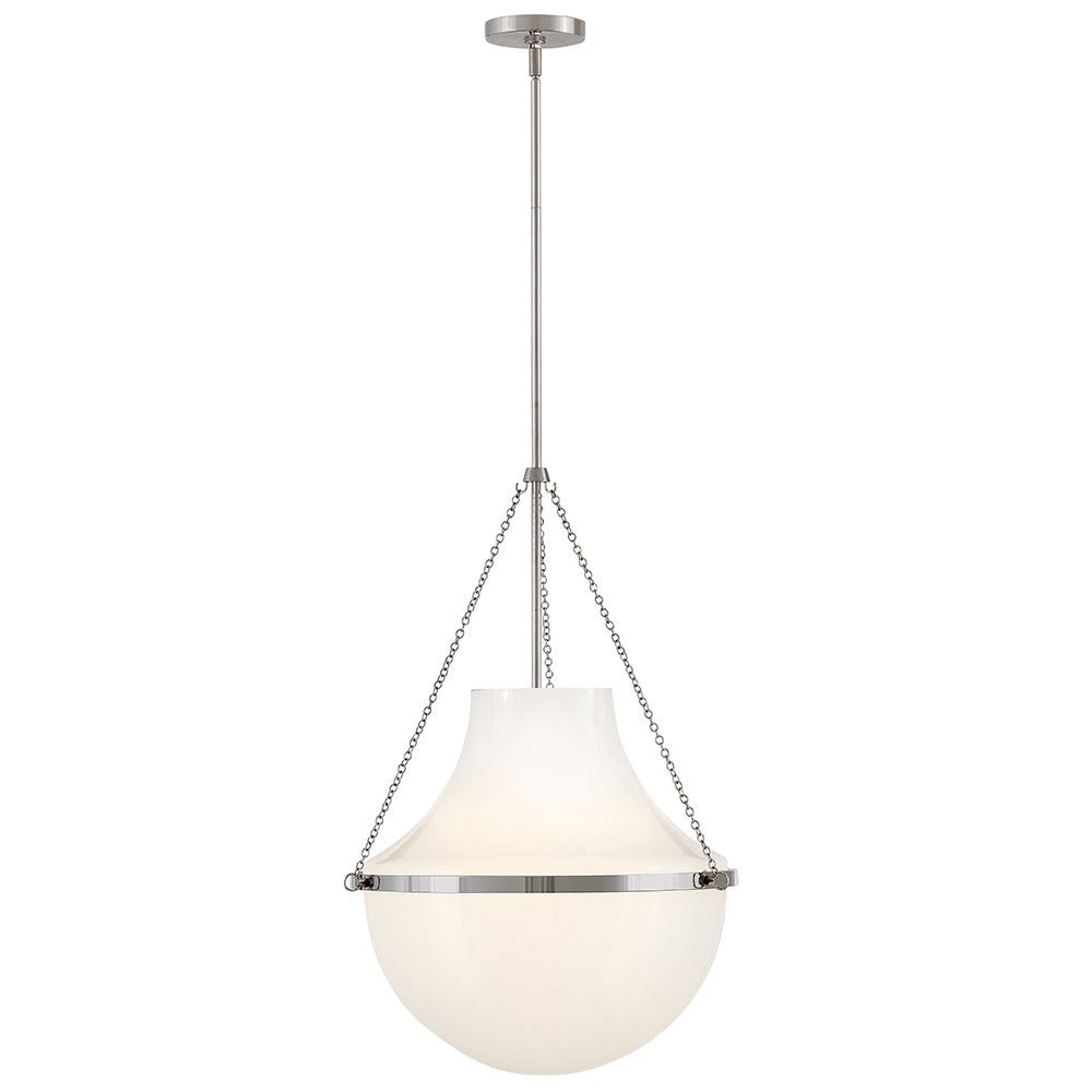 Fusing a sculpted, modern form with classically styled details, Collins features a transitional teardrop shade crafted from blown, cased opal glass. A central metal band and delicate chain uprights are available in Heritage Brass or Black Oxide finishes.