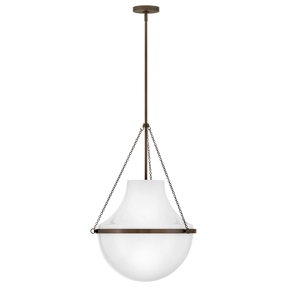 Fusing a sculpted, modern form with classically styled details, Collins features a transitional teardrop shade crafted from blown, Cased Opal glass. A central metal band and delicate chain uprights are available in Black Oxide, Heritage Brass, Heritage Bronze, or Polished Nickel finishes.