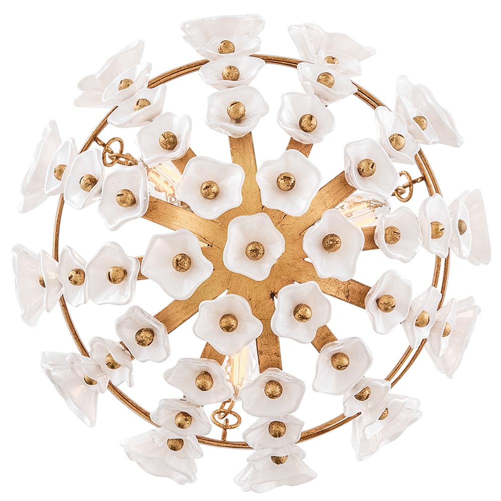 Inspired by the natural romance of annual spring blooms, Azalea’s intricate silhouette is adorned with double-layered glass blossoms crafted from clear and white glass. A Distressed brass frame complements an abundance of warm, ambient illumination from dimmable candelabra lamps.