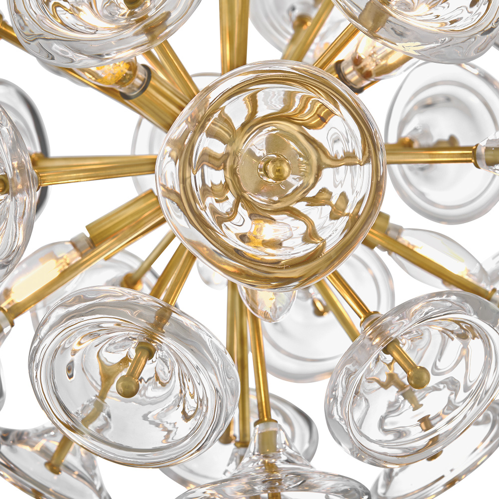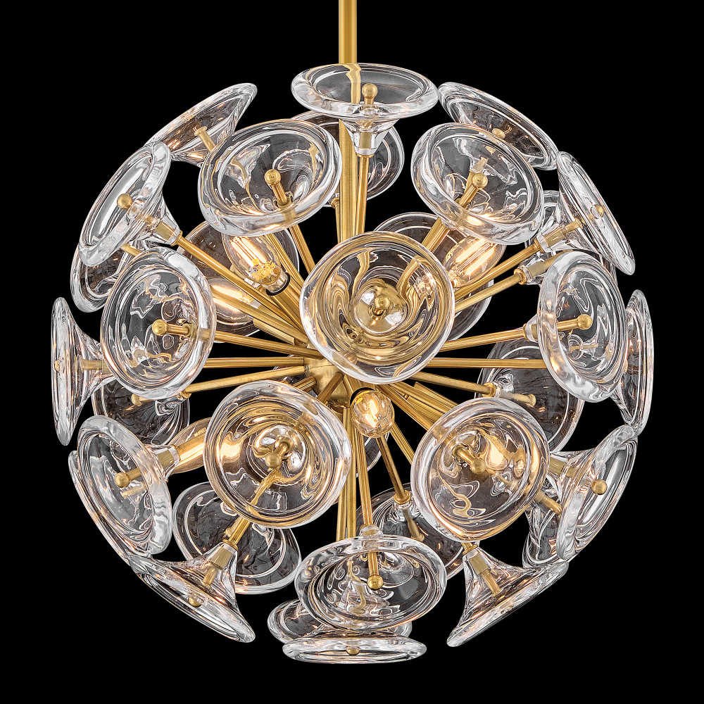 Capturing the essence of natural elegance seen through a contemporary lens, Maya’s hand-blown trumpet blossoms are artfully arranged in radiant bouquets to cast an enchanting aura. Intricate solid brass frames suspended from minimal stems and canopies are hand-painted in a chic Unlacquered Brass finish, adding a classic touch to your decor palette.