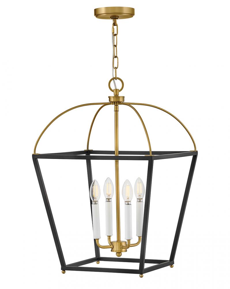 With accent curves in all the right places, Tate’s classic, lantern-style profile makes a glorious statement in any dining room or living space. Bold Black and Lacquered Brass finishes easily complement any décor.