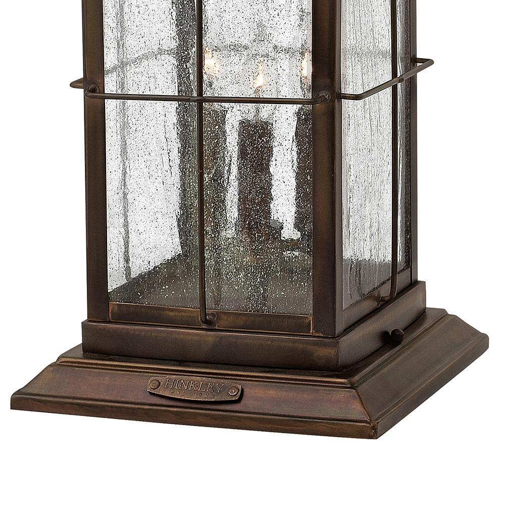 Bingham’s traditional style recalls a turn-of-the-century gas light reproduction. The vintage look is nautical in nature and recognizes Hinkley’s origins on the shores of Lake Erie. The aluminum construction features clear seedy glass and a Greystone or Sienna finish, while candelabra bulbing completes the authentic style.