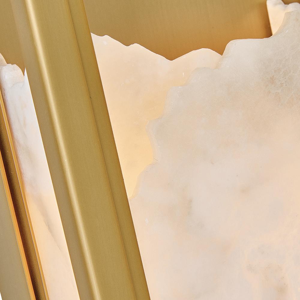 Inspired by Italian design, Valeta’s natural alabaster shade with jagged top edges is showcased by a geometric Lacquered Brass frame. Truly one-of-a-kind graining, color variations, and organically formed textures make each Veleta fixture genuinely unique.