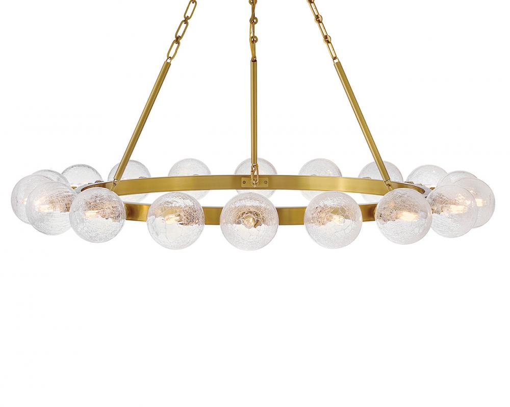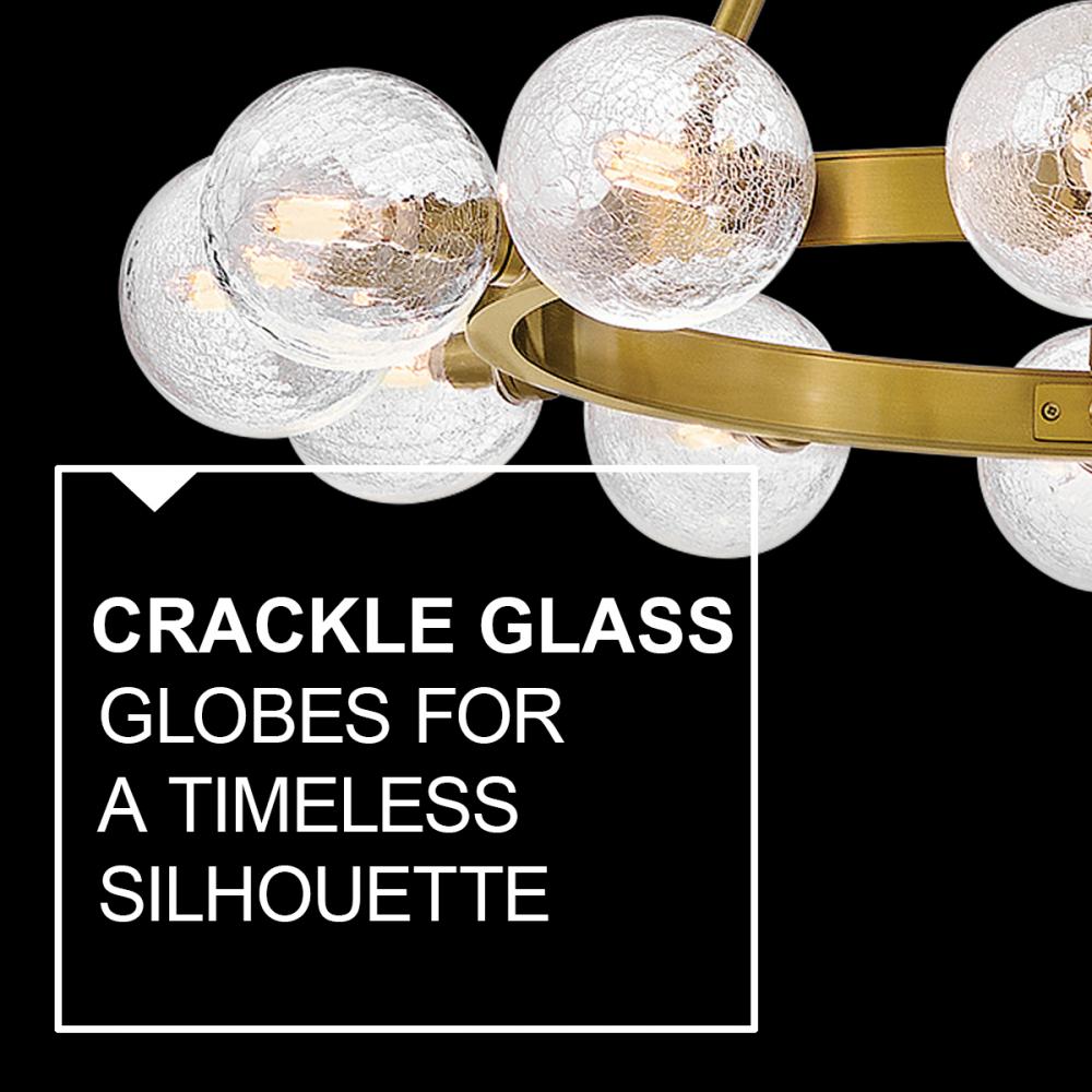 Dramatic crackled glass globes surround Coco’s timeless silhouette with unexpected, distressed detailing. Minimal framing suspended from decorative stem-to-chain uprights features a warm and inviting Lacquered Brass finish.