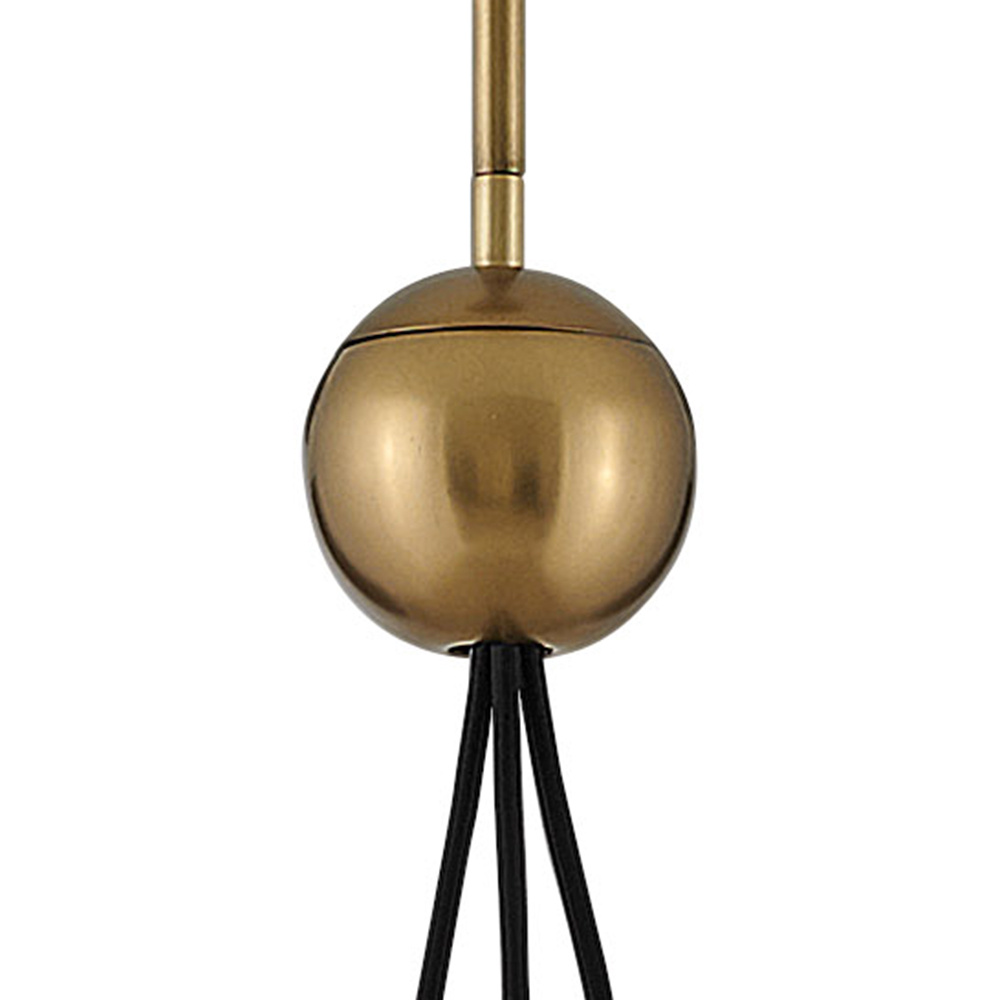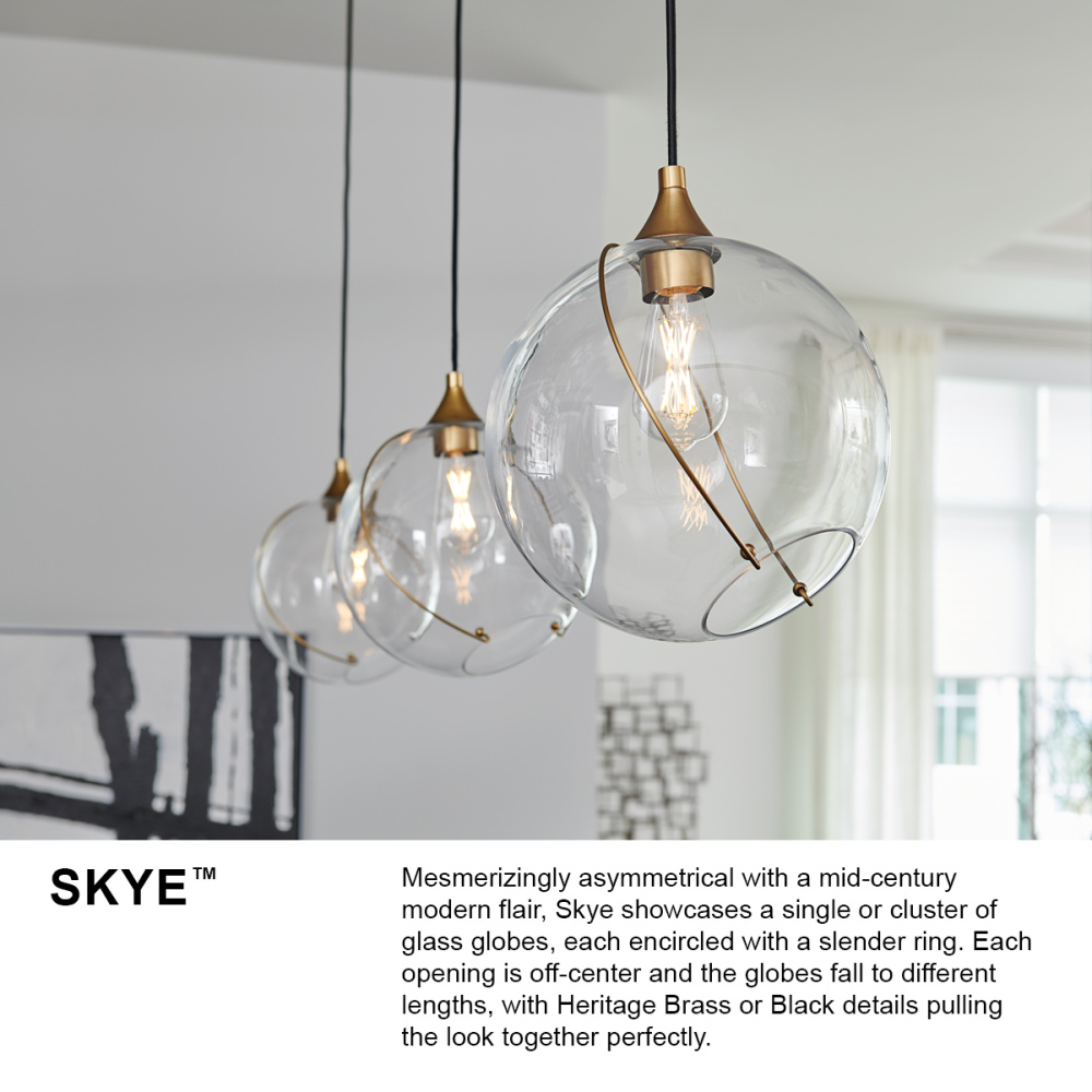 Mesmerizingly asymmetrical with a mid-century modern flair, Skye showcases a single or cluster of glass globes, each encircled with a slender ring. Each opening is off-center and the globes fall to different lengths, with Heritage Brass or Black details pulling the look together perfectly.
