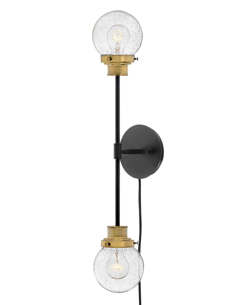 Poppy features clear seedy glass spheres that bubble out of refined, ribbed fitters to create a simple, yet sophisticated silhouette. The dual-finish combinations, Black with Brushed Nickel and Black with Heritage Brass, pair perfectly with a clean backplate or canopy and crisp crossbars to anchor this airy design. Poppy showcases mid-century style with a spectacular spin.