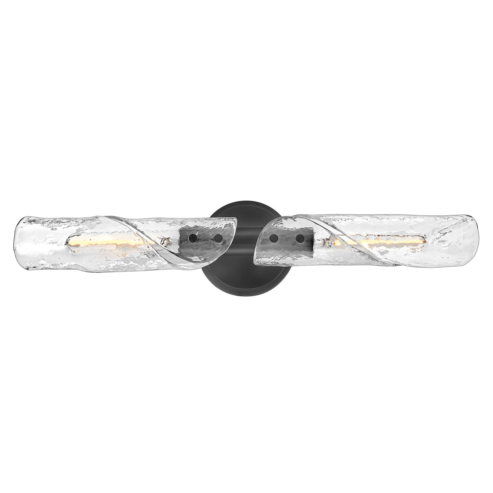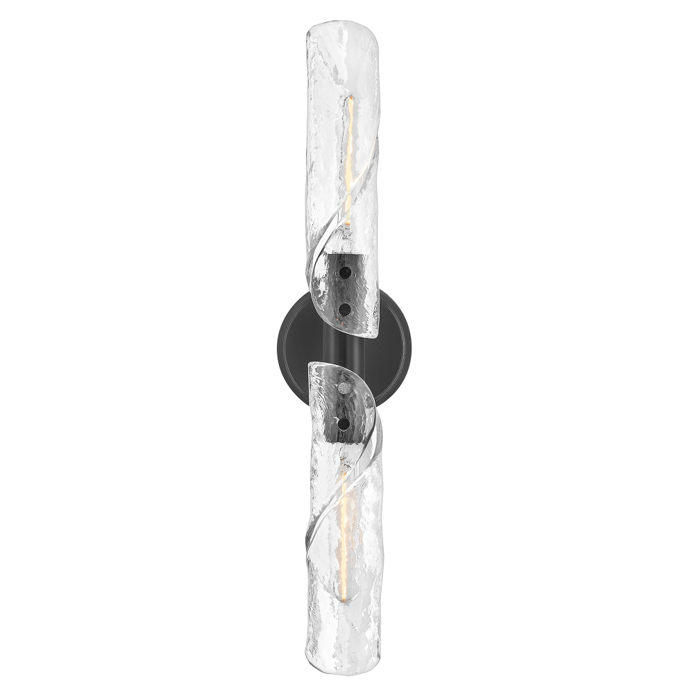 Evoking the movement of flowing water, Capri’s linear, clear glass shades are pressed to create a subtle crystalline texture, then twisted and shaped by hand. Metal backplates and rounded knobs finished in Black or Distressed Brass provide balance that anchors the organic form, resulting in a look that feels both refreshing and refined.