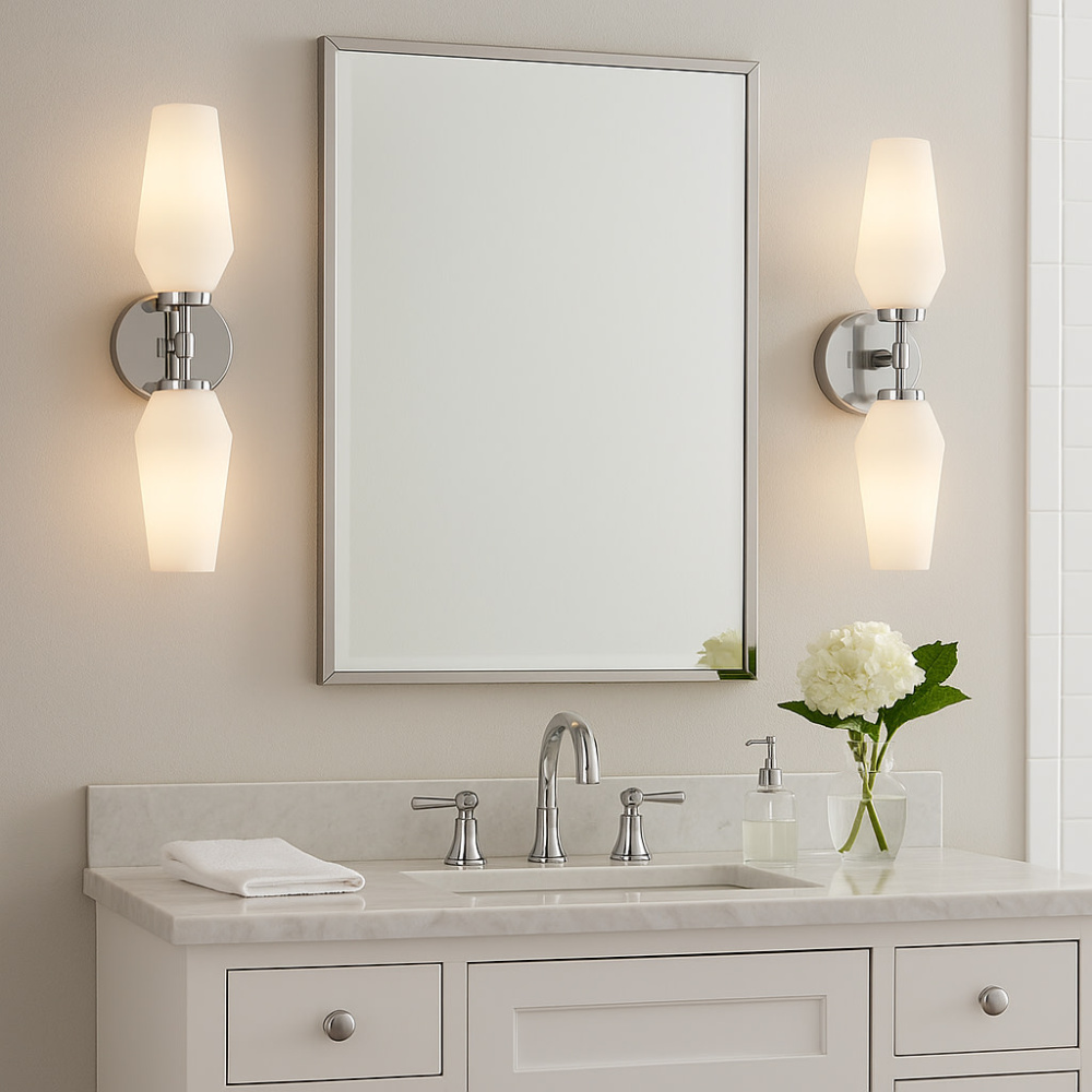 Create a refreshing mood with just the right touch of glamour. Gio's captivating geometric design with subtly curved, etched or cased opal glass brings enchanting style to your bath or living space.