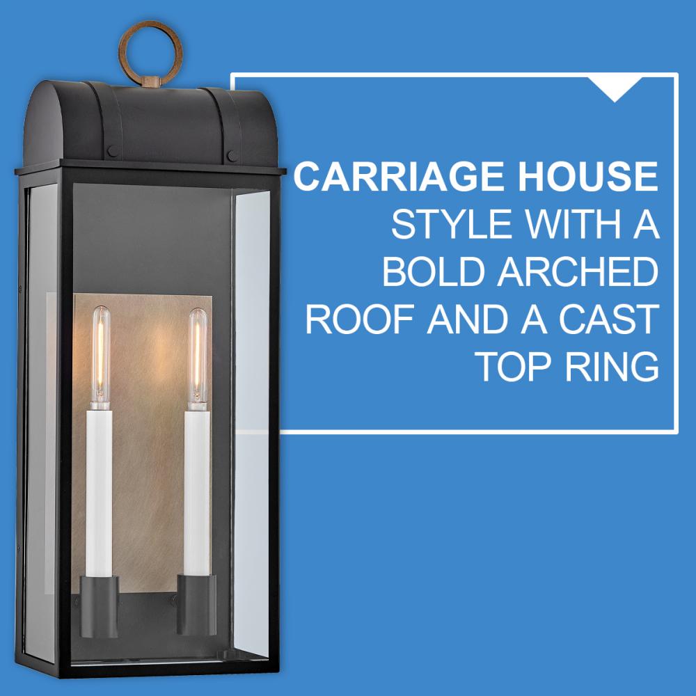 Inspired by traditional colonial lanterns, Campbell’s carriage house styling complements classic architecture accentuated by a bold arched roof and a cast top ring. Candelabra lamps with contrasting warm white candle sleeves are enhanced by a Black with Burnished Bronze finish and a reflective backplate.
