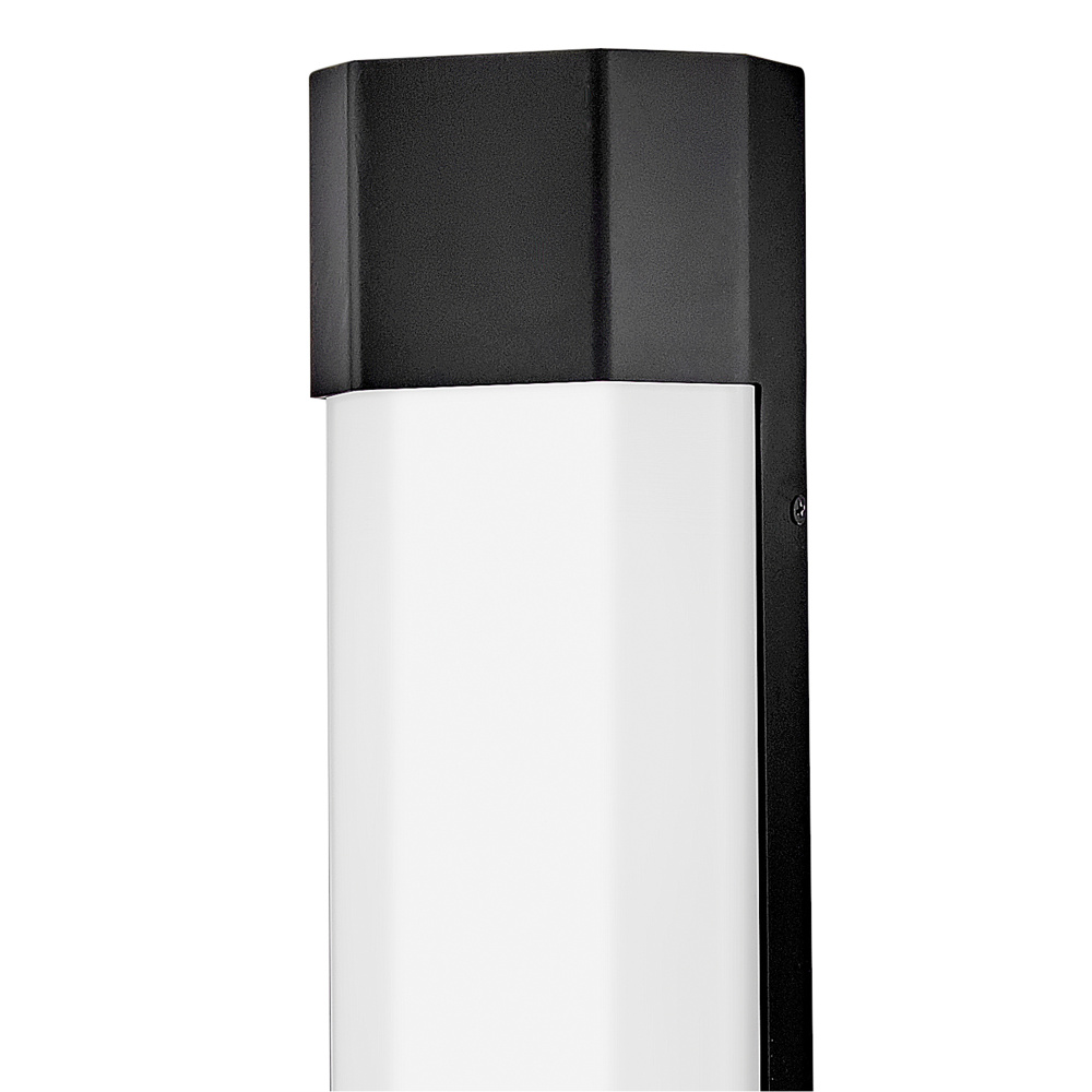 View the many sides of Facet. Interesting angles combine with bold metal features to create an edgy and contemporary profile that is unpretentious yet unforgettable. Hexagonal etched white glass is showcased by a bold Black finish.