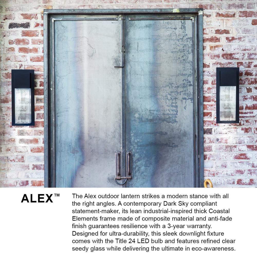 The Alex LED outdoor lantern strikes a modern stance with all the right angles. A contemporary statement-maker, its industrial-inspired thick Coastal Elements frame made of composite material and anti-fade finish guarantees resilience with a 3-year warranty. Designed for ultra-durability, this downlight fixture comes with an LED bulb and is available in versatile Antique Brushed Aluminum or Black finish options. Alex is equally happy indoors, turning heads as an interior wall sconce.