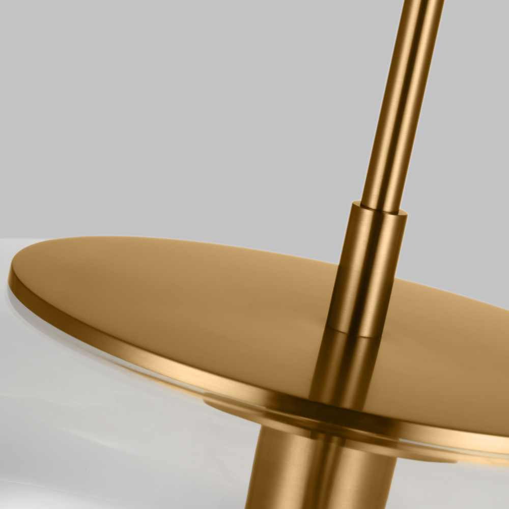 Designed by Thomas O'Brien, Largo is inspired by a 1960’s Danish ceramic dish turned upside down. Crafted from steel, Largo offers a signature focal point with a single lamp suspended downward from the center. A hint of Burnished Brass peeks through the Clear glass, becoming the fixture's central design element. The Largo pendants may be installed as single pendants or clustered in multiples, which would be an ideal installation for entry, dining room, living room, or kitchen lighting over a table. In addition to being damp-rated, the pendant can be mounted on a sloped ceiling.