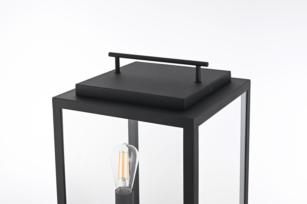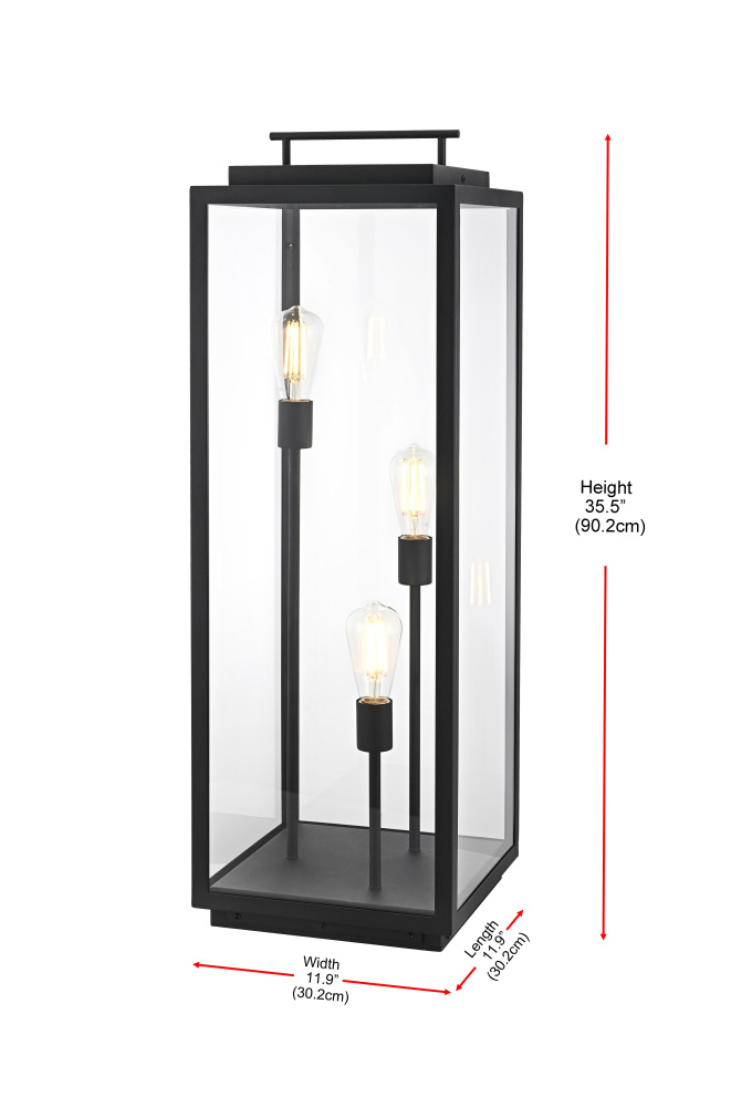 Transform an outdoor space with a striking lawn light that merges bold structure with practical illumination. A defined rectangular frame in matte black iron encloses three exposed bulbs, casting multi-directional light through crystal-clear glass panels. The staggered bulb placement enhances the design with depth and dimension, creating a floating effect that draws attention to landscaped pathways and garden features. A sturdy base ensures stability on various outdoor surfaces, while the wet-rated construction withstands rain and moisture for long-lasting performance. Designed with three E26 sockets (bulbs not included), this statement lawn light offers versatility with Edison, LED, or traditional bulbs. Whether highlighting a garden pathway or adding ambiance to a courtyard, this architectural lantern makes a commanding outdoor presence.