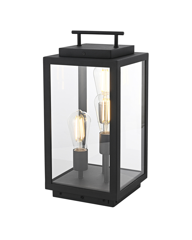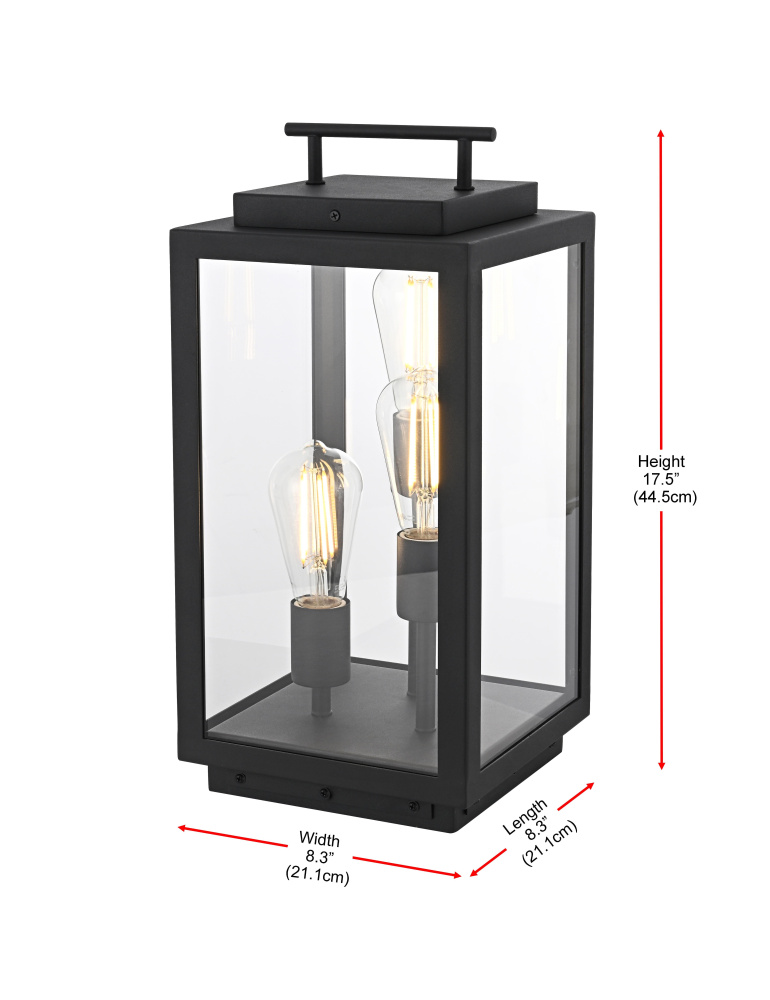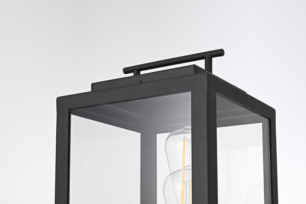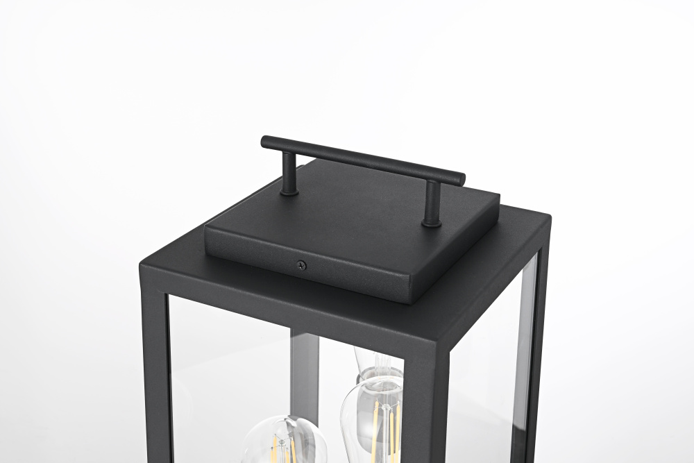 Transform an outdoor space with a striking lawn light that merges bold structure with practical illumination. A defined rectangular frame in matte black iron encloses three exposed bulbs, casting multi-directional light through crystal-clear glass panels. The staggered bulb placement enhances the design with depth and dimension, creating a floating effect that draws attention to landscaped pathways and garden features. A sturdy base ensures stability on various outdoor surfaces, while the wet-rated construction withstands rain and moisture for long-lasting performance. Designed with three E26 sockets (bulbs not included), this statement lawn light offers versatility with Edison, LED, or traditional bulbs. Whether highlighting a garden pathway or adding ambiance to a courtyard, this architectural lantern makes a commanding outdoor presence.