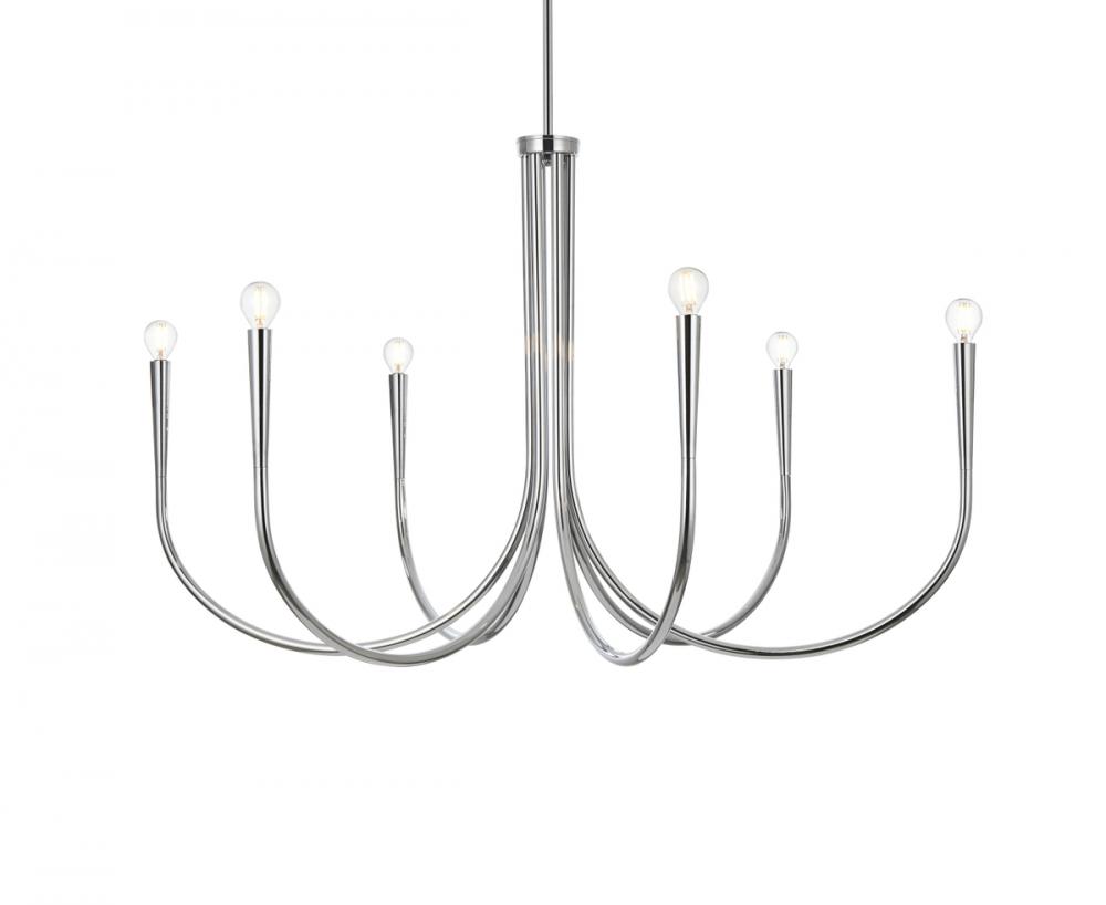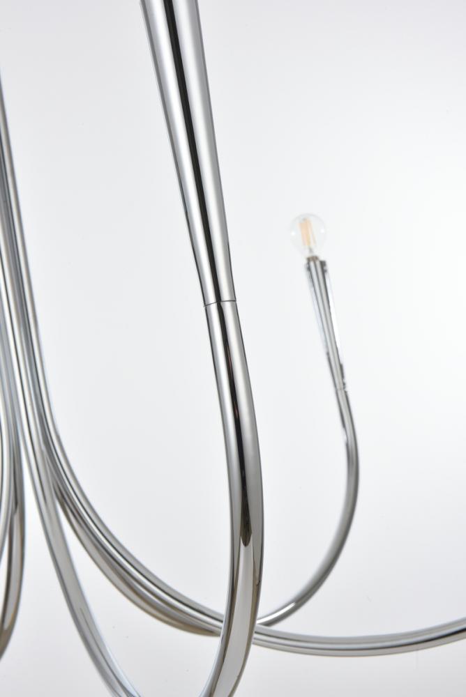This chandelier stands out with its distinctive and eye-catching design. The smooth, soft thick metal scooped tubular arms gracefully culminate in a sleek conical shape, creating a mesmerizing visual effect that captivates anyone who lays eyes on it.