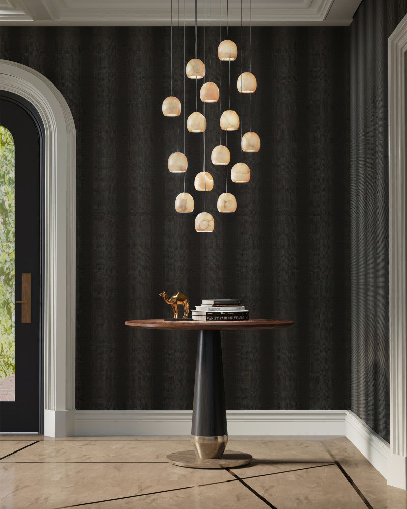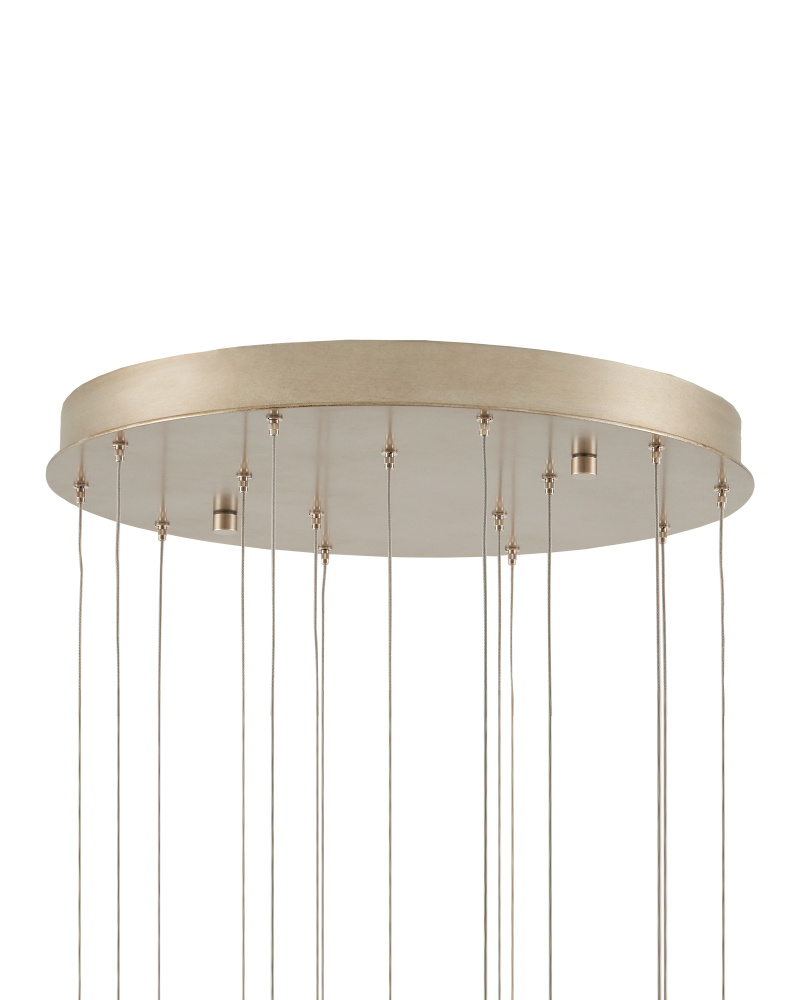 The Lazio Round 15-Light Multi-Drop Pendant has luminous shades carved from natural alabaster. The veining in the material makes each shade unique because each stone taken from the earth will have its own personality. The canopy of this piece is luminous in a painted silver finish. This fixture is among Currey & Company's multi-drop pendant collection, which includes multiple configurations.