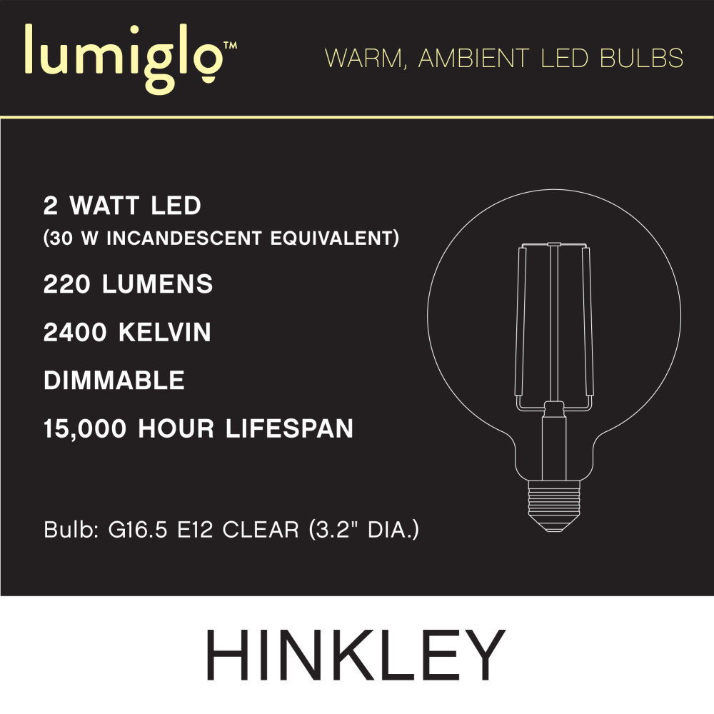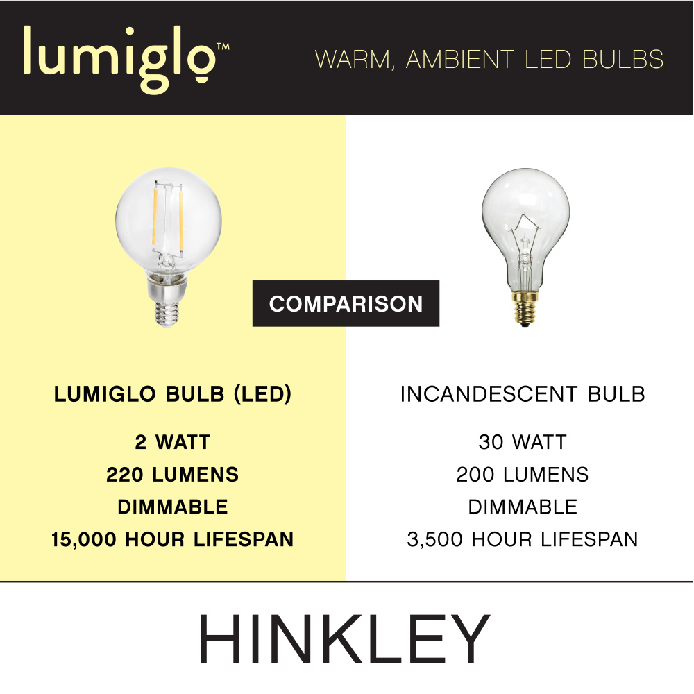 To create superior, softer light that sets the scene in any indoor or outdoor setting, Hinkley’s Lumiglo™ LED bulbs feature unique filament technology designed to cast a warm ambient glow. Dimmable functionality provides full control over brightness, allowing you to craft an atmosphere that perfectly accentuates your space.