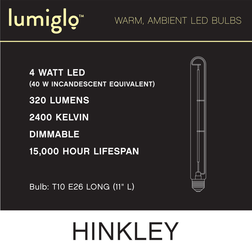 To create superior, softer light that sets the scene in any indoor or outdoor setting, Hinkley’s Lumiglo™ LED bulbs feature unique filament technology designed to cast a warm ambient glow. Dimmable functionality provides full control over brightness, allowing you to craft an atmosphere that perfectly accentuates your space.