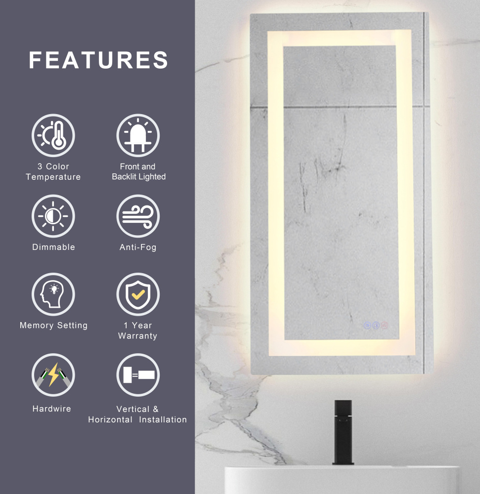 Redefine your daily routine with this ultra-modern LED mirror, designed to offer the perfect blend of style and functionality. Featuring both front and back illumination, this mirror provides a soft yet powerful glow that enhances your space with a luxurious ambiance. The adjustable color temperature (ranging from 3000K to 6400K) allows you to customize the warmth or coolness of your lighting, while the dimmable function lets you create the perfect brightness level. With a 90 CRI rating, this mirror ensures accurate color representation, making it perfect for grooming, makeup application, or daily self-care. The built-in defogger keeps your reflection clear and can be turned on or off at your convenience. Thanks to the touch sensor controls, adjusting your mirror's settings is effortless, and the memory function saves your last preferred settings for a seamless experience. Designed for versatile installation, this mirror can be hung vertically or horizontally using the included French cleats, making it a stunning and adaptable addition to any bathroom or vanity. It can be hardwired or connected to a wall switch for your convenience. Elevate your space with a mirror that not only reflects your image but also enhances your everyday routine with smart, modern lighting.