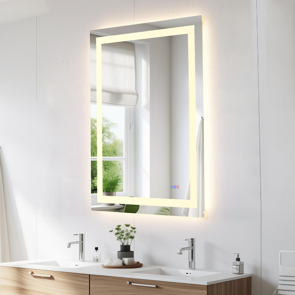 Redefine your daily routine with this ultra-modern LED mirror, designed to offer the perfect blend of style and functionality. Featuring both front and back illumination, this mirror provides a soft yet powerful glow that enhances your space with a luxurious ambiance. The adjustable color temperature (ranging from 3000K to 6400K) allows you to customize the warmth or coolness of your lighting, while the dimmable function lets you create the perfect brightness level. With a 90 CRI rating, this mirror ensures accurate color representation, making it perfect for grooming, makeup application, or daily self-care. The built-in defogger keeps your reflection clear and can be turned on or off at your convenience. Thanks to the touch sensor controls, adjusting your mirror's settings is effortless, and the memory function saves your last preferred settings for a seamless experience. Designed for versatile installation, this mirror can be hung vertically or horizontally using the included French cleats, making it a stunning and adaptable addition to any bathroom or vanity. It can be hardwired or connected to a wall switch for your convenience. Elevate your space with a mirror that not only reflects your image but also enhances your everyday routine with smart, modern lighting.