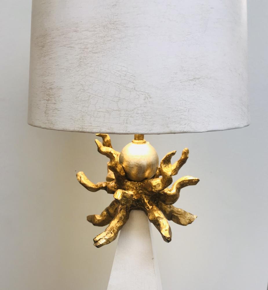 A 32" table lamp with a 6.5" gold leaf base and patina gold finish. Its whimsical elegance suits master suites or studies, enhanced by books or candleholders with a shabby chic-eclectic charm.