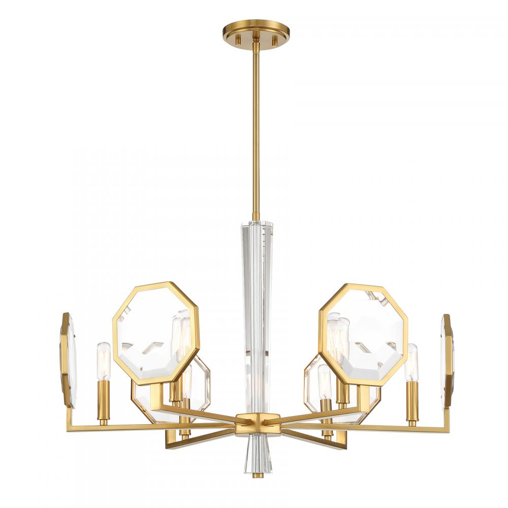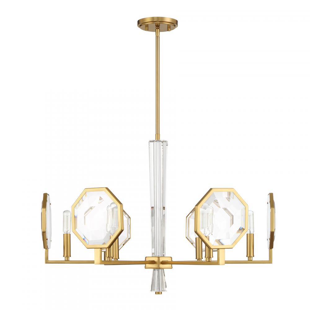 The gorgeous and geometric Savoy House Leighton 6-light chandelier is sure to become a spectacular focal point in your home. A clear crystal central column is flanked by flat, angular arms that each hold a large faceted K9 crystal shade in an octagonal shape. The Warm Brass finish is a perfect match. Leighton is 28" in width and has an adjustable height ranging from 19.5" to 73.5". Comes with four 12" downrods and one 6" downrod. Uses six candelabra size bulbs of up to 60 watts per bulb. Bulbs not included.