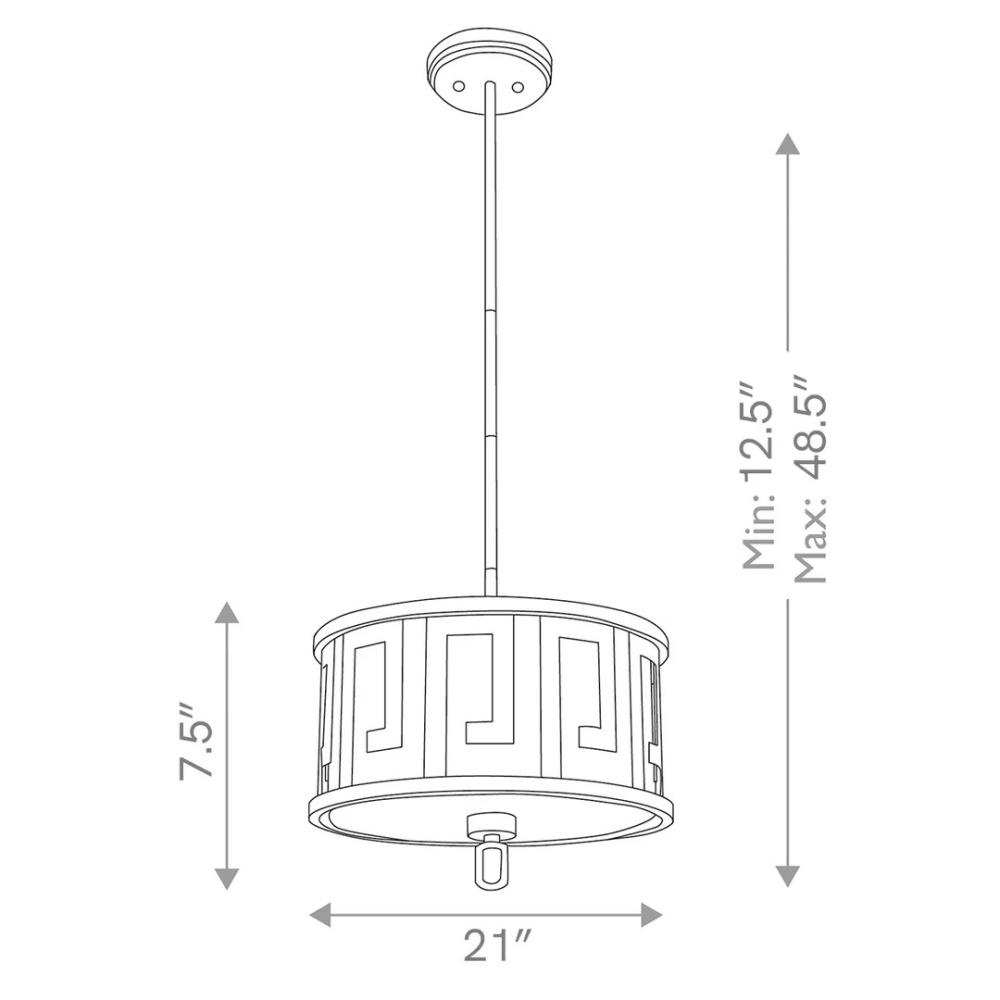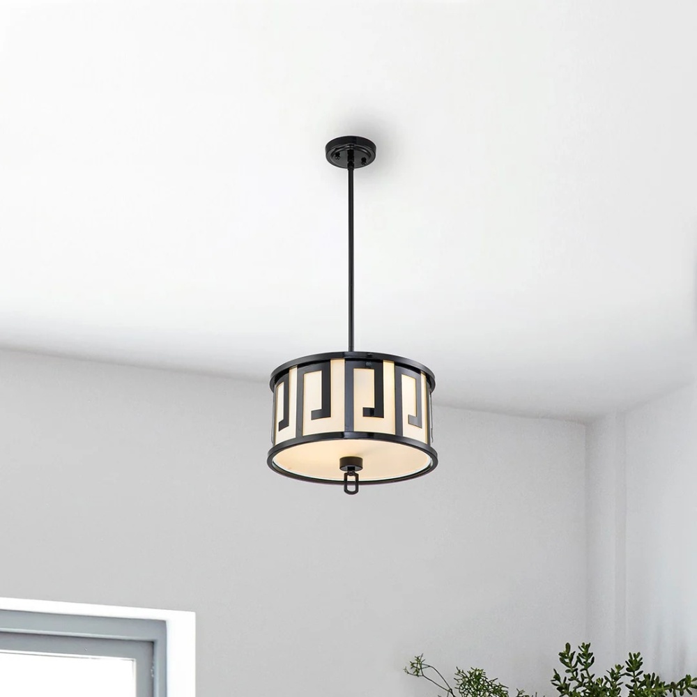 A 15" dia. adjustable pendant in black with a Greek key drum and ivory linen shade. With a diffuser, it suits kitchens or bars, convertible to 12.5" semi-flush. This bold piece blends trend and charm.
