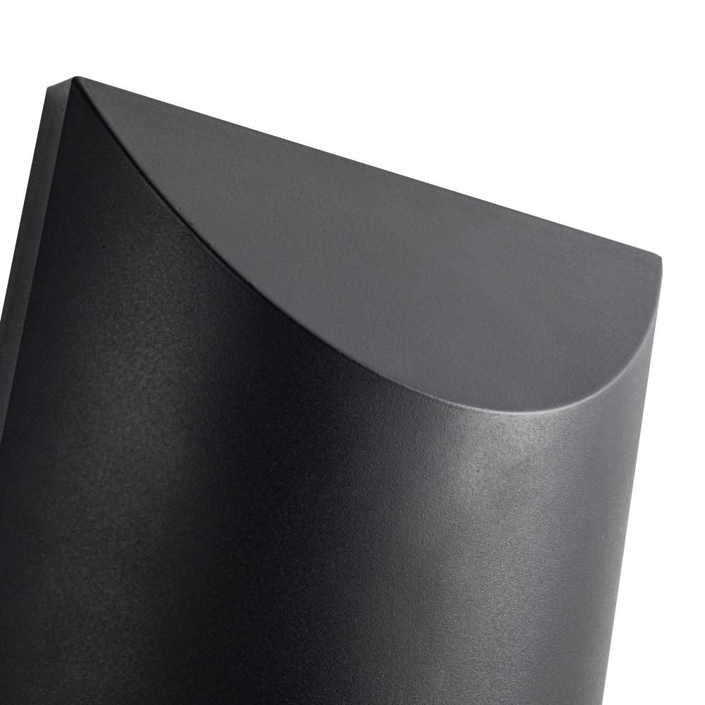 High power LED exterior wall mount fixture intended for use as a downlight. Lenox’s die-cast aluminum housing is 8-inch square in its front view, but as the viewer moves to the side the fixture’s profile becomes a gently swept curve suggestive of a water drop or perhaps a ship’s sail filling with wind. Lenox aimed downwards through its polymeric diffuser lights both the mounting plane and floor.