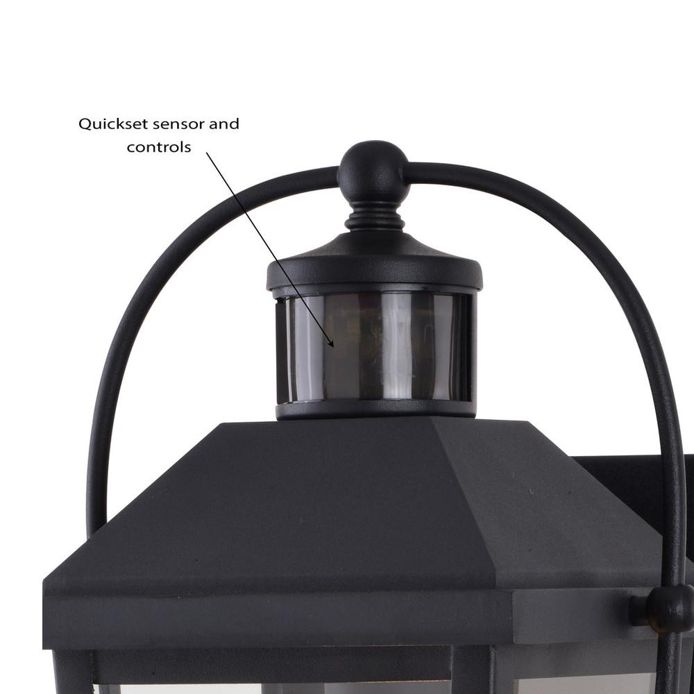 The colonial inspired Lexington collection is steeped in traditional charm. A textured black finish coupled with tapered, clear glass panels are further enhanced with a curved metal lantern handle creating a carriage house lantern look. This outdoor wall light is ideal for your covered porch, entryway, garage, or any other area of your home. Dualux patented dual-level security lighting is outdoor lighting made smarter - brighter light at dusk, dimmer at night, brightening instantly when it detects motion. Designed to reliably and effortlessly enhance your home’s beauty, security and efficiency from dusk to dawn with its built in motion sensor and photocell. This fixture works with any dimmable incandescent or halogen bulb and most dimmable LED bulb models. This decorative outdoor security light is designed to enhance the beauty, safety, and efficiency of your home.
