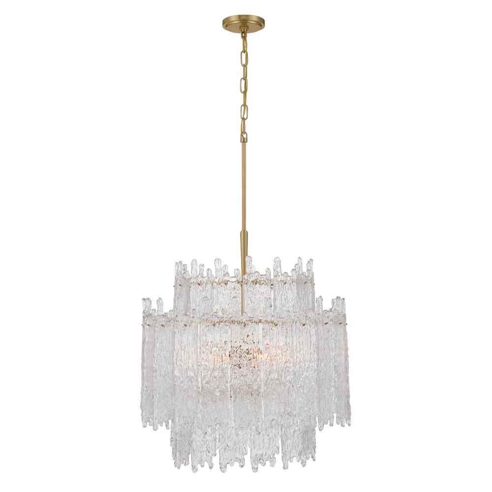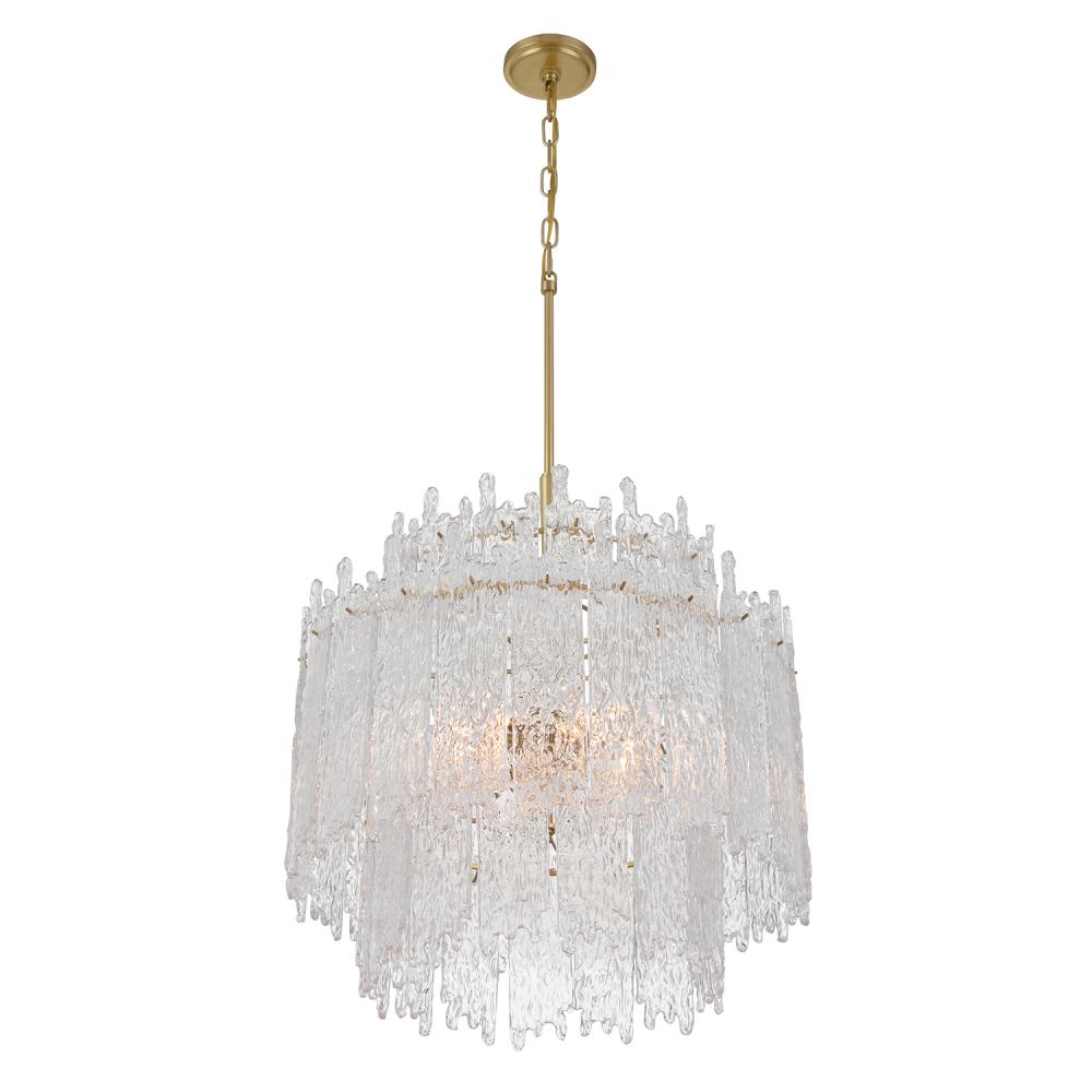 The Ackerly Collection showcases stunning ice glass, a textured material that resembles frozen or cracked ice. Its frosted, crystalline surface uniquely scatters light, producing a soft, diffused glow. This organic, sculptural effect adds a modern yet slightly retro touch to the design. The Ackerly Collection combines elegance with an artistic, edgy aesthetic, making it a standout in any space.