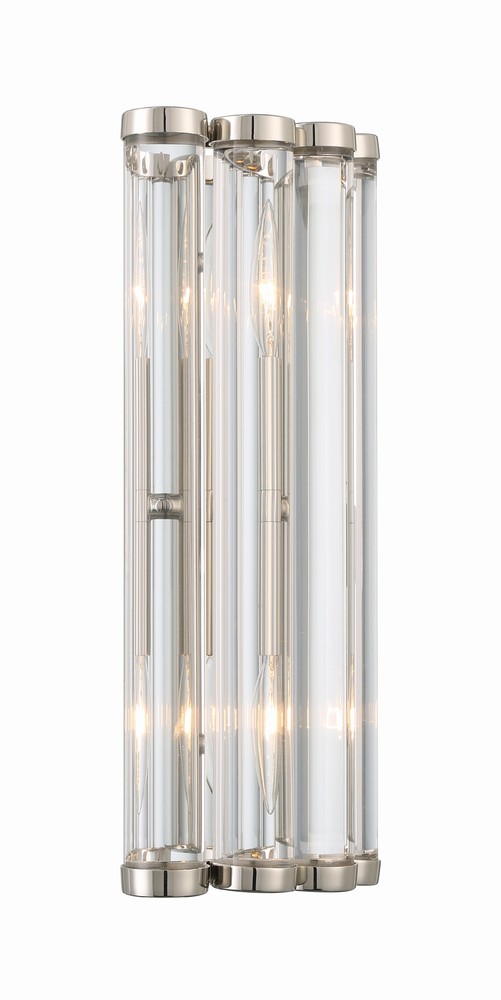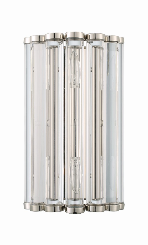 The Elliot collection, designed by Libby Langdon, is a sleek and almost masculine collection featuring a series of chunky Lucite rods and a polished nickel frame to highlight the shape. The fixture's view from below is as important as what it looks like from the side. The metal work follows the shape of the circular rods creating a scallop pattern. The filtered light bounces between the Lucite rods and gives off a beautiful glow. Architectural in nature, the Elliot is a modern take on a crystal-style wall mount.