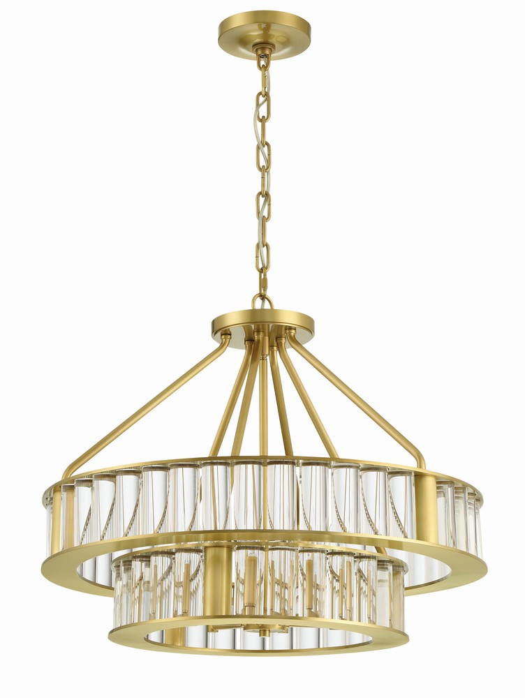 The Libby Langdon Farris chandelier is a study of simple elegance. The two-tier frame is made up of thick solid glass rods and a sleek and lean circular metal frame in a brushed, Vibrant Gold brass finish. The upper metal rods that connect both tiers to the canopy are round and have a slight eased bend as they meet the round frame to add a little softness. The Farris chandelier is as beautiful to look at from the bottom as it is to see it from the side; the scale and size of the piece feel luxurious and substantial without feeling clunky or too heavy.