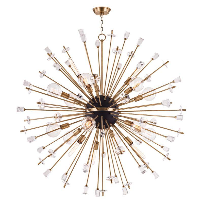 Liberty starts with a core of matte-black metal, banded round its middle with a flashing contrast from the piece’s finish of choice—brass or nickel. Retro coil bulbs in ballooning clear glass create the primary light source; in larger models, tubular exposed-filament bulbs alternate. Cut-crystal discs and icy handcrafted glass adorn protruding rods, refracting the dazzling light in a thousand directions.