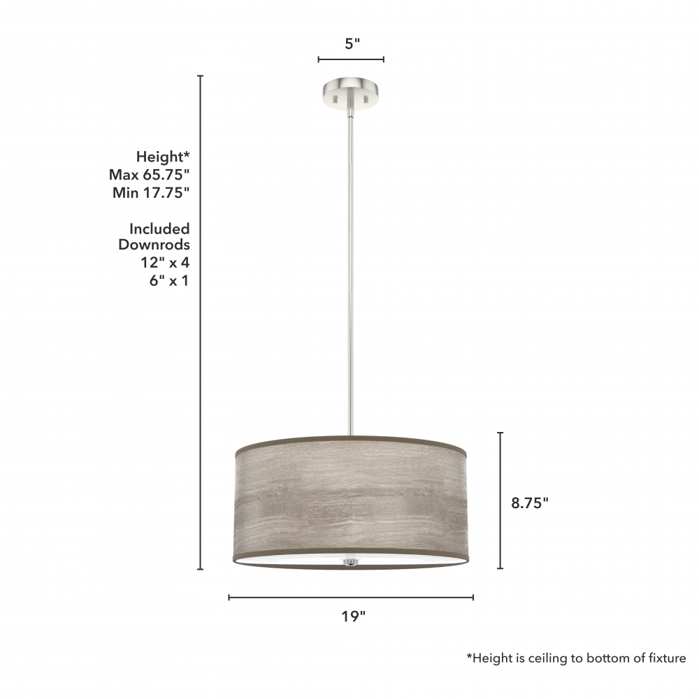 CUSTOMIZABLE HANGING OPTIONS: With the minimum required downrod, the hanging length is 17.75 inches. When using all of the included downrod, the maximum hanging length is 65.75 inches.
