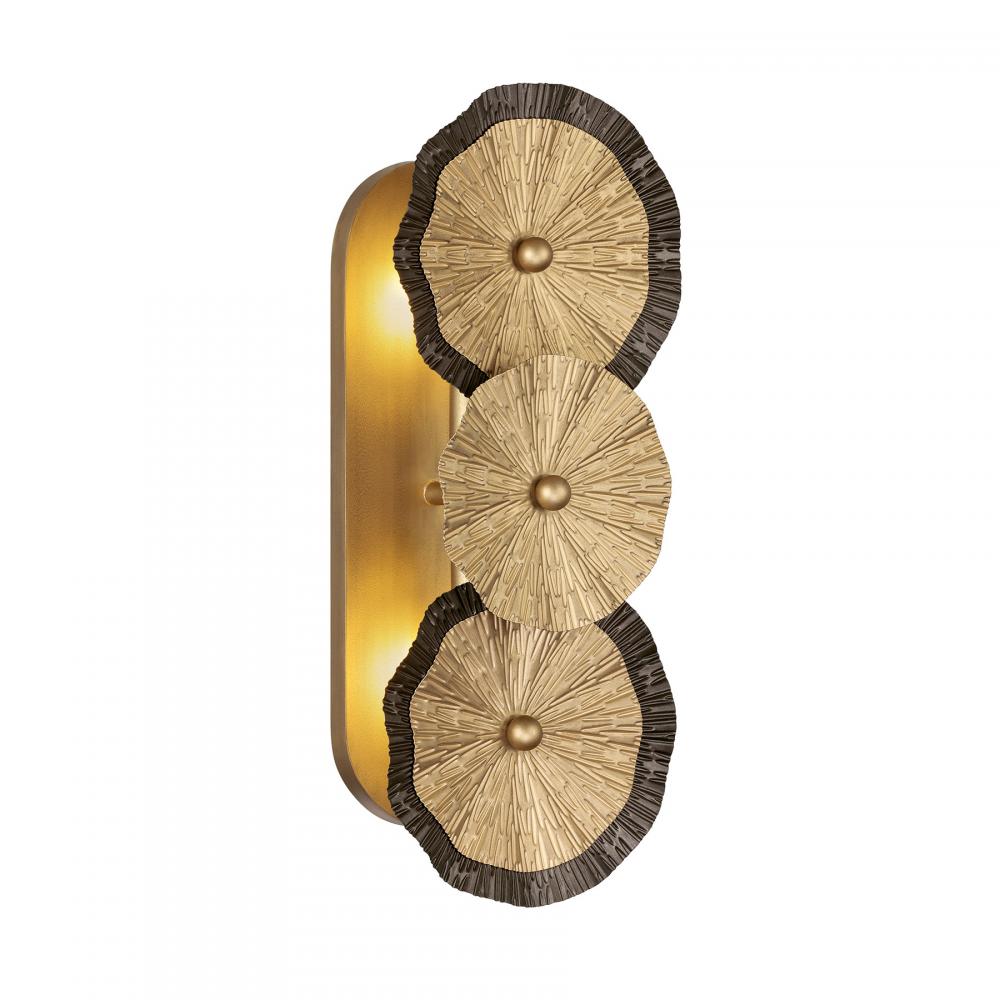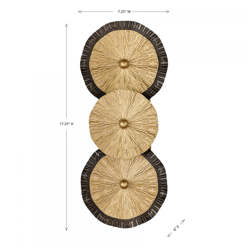 The Savoy House Lincoln 2-light sconce was designed by Breegan Jane, an award-winning interior designer and TV host. Breegan is from California and infuses her designs with the laid-back, organic touches that are characteristic of the Golden State. Lincoln holds spectacular eye-catching wheels finished by hand in Distressed Gold and Bronze, bringing a big dose of touchable texture and glamour. Lincoln is 17.25" in height, 7.25" in width and extends 6" from the wall. It uses two candelabra size bulbs of up to 60 watts per bulb. Bulbs not included. This sconce is damp area rated.