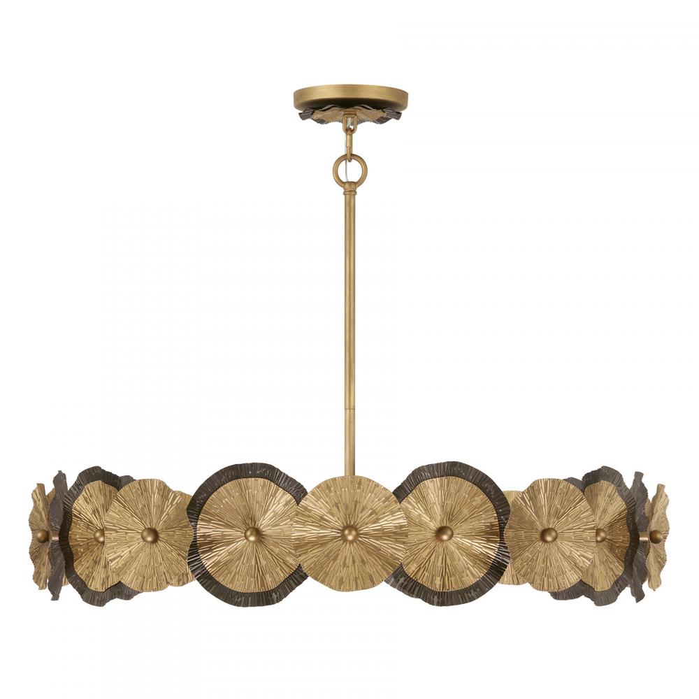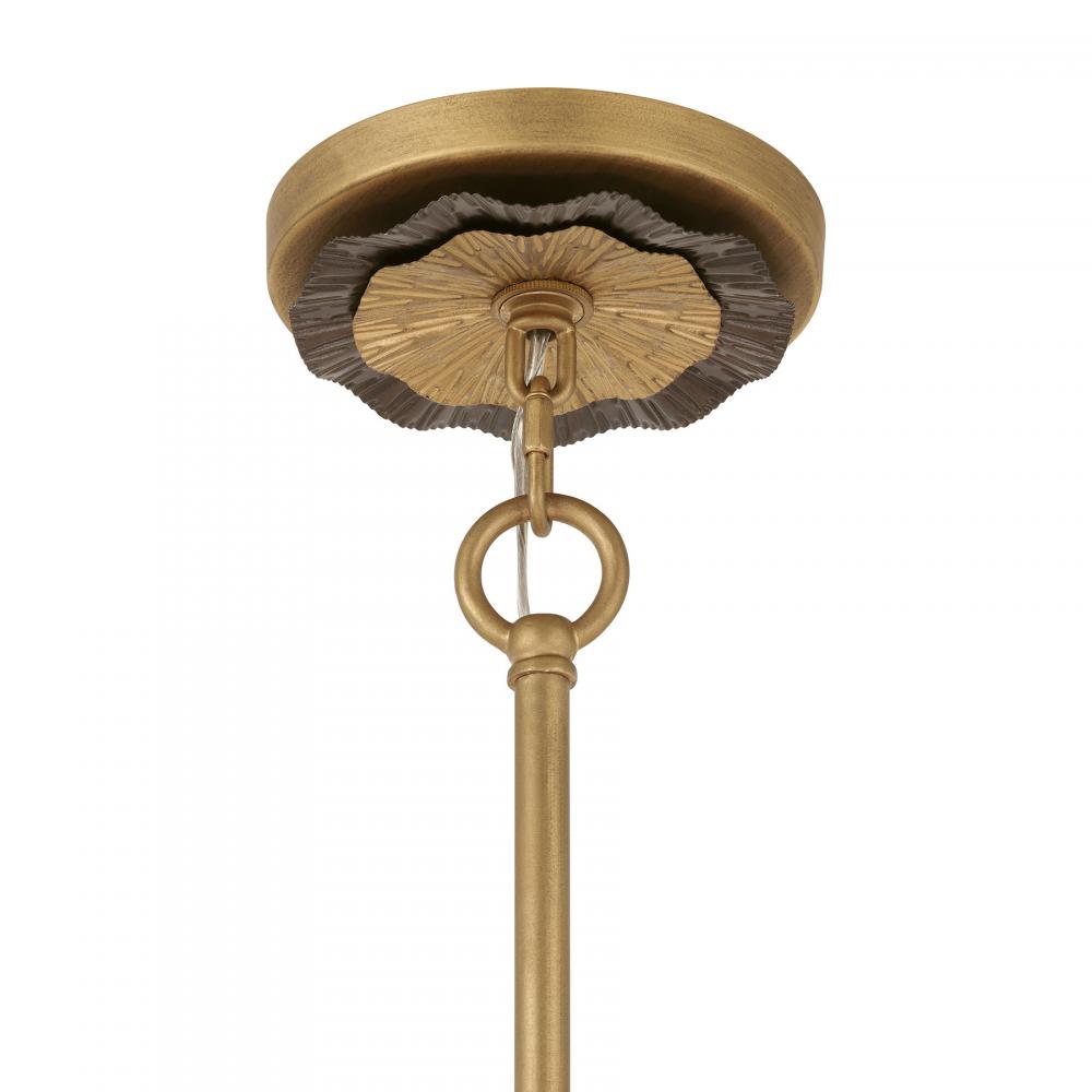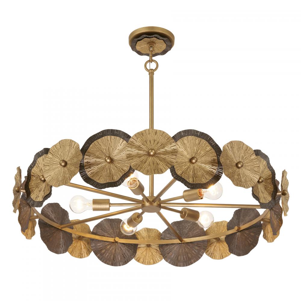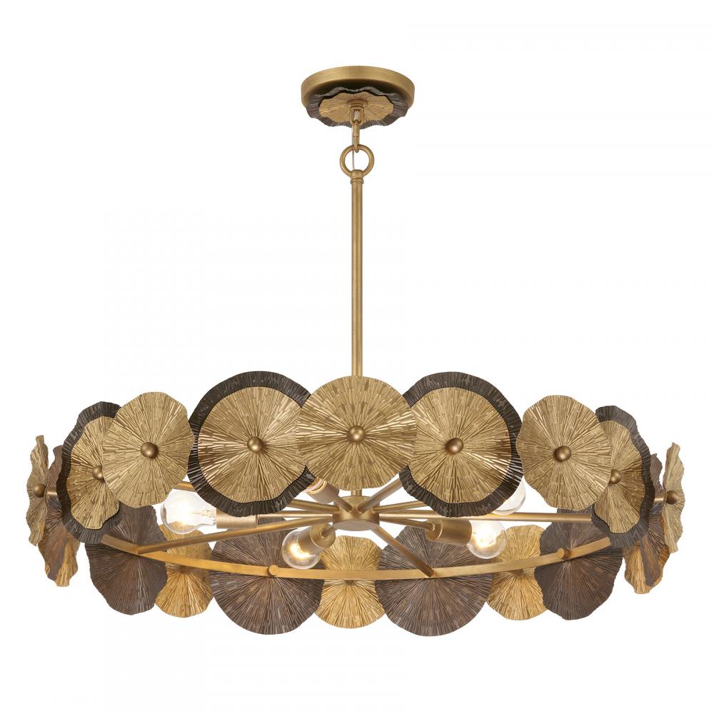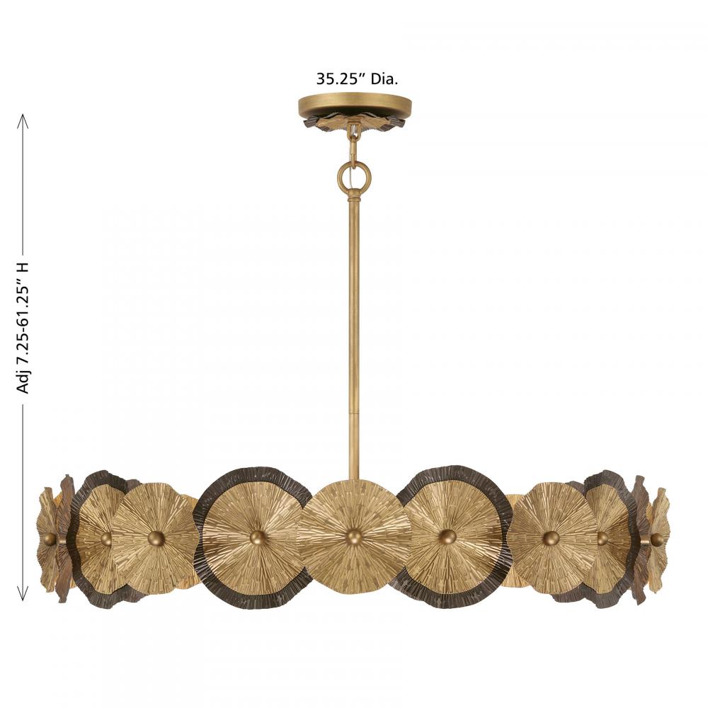 The Savoy House Lincoln 5-light pendant was designed by Breegan Jane, an award-winning interior designer and TV host. Breegan is from California and infuses her designs with the laid-back, organic touches that are characteristic of the Golden State. Lincoln holds spectacular eye-catching wheels finished by hand in Distressed Gold and Bronze, bringing a big dose of touchable texture and glamour. Lincoln is 35.25" in width and has an adjustable height ranging from 7.25" to 61.25". It uses five standard size bulbs of up to 60 watts per bulb. Bulbs not included. Comes with four 12" downrods and one 6" downrod.