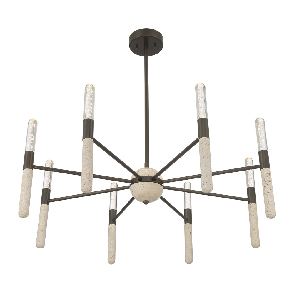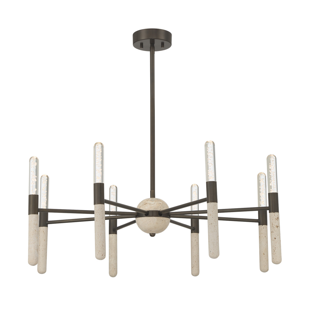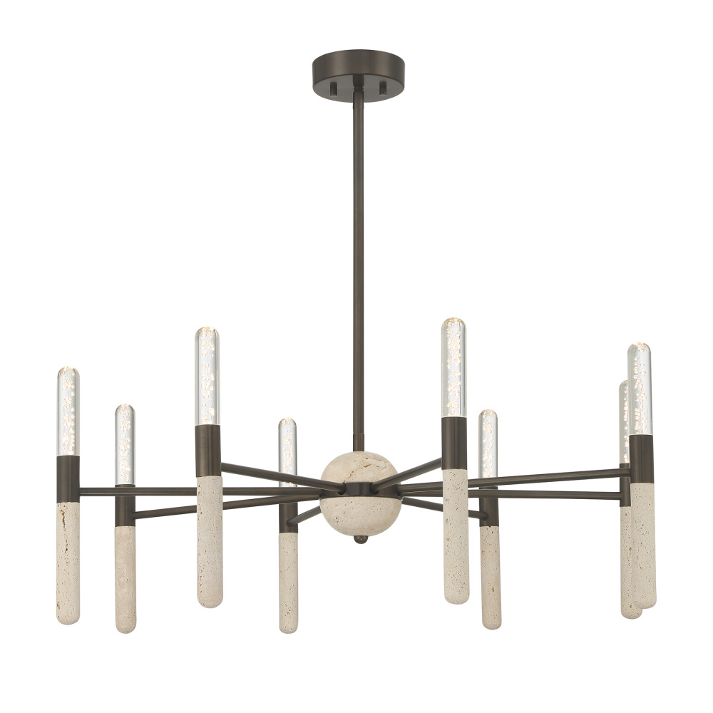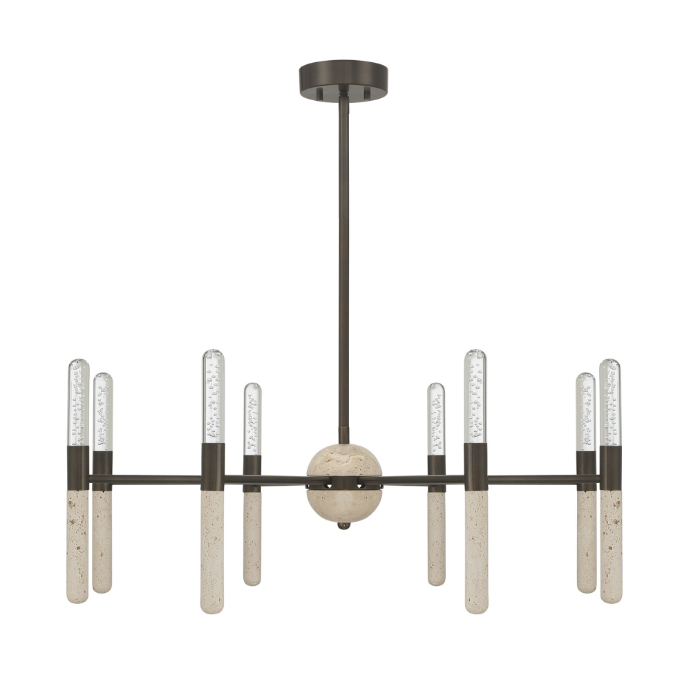 The Savoy House Linden 8-light chandelier brings an uplifting blend of organic texture and contemporary clarity to any room. Sleek tubes of clear bubble glass glow from within thanks to integrated LED light, creating an uninterrupted, sculptural presence. Accents of beige travertine introduce natural character through tiny pits and variations that celebrate the beauty of imperfection. The Mediterranean Bronze finish enriches the look with a warm, grounded glow. Linden is 32" wide and offers an adjustable height from 15" to 63". Includes four 12" downrods and one 6" downrod.