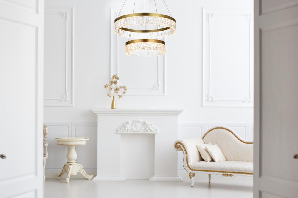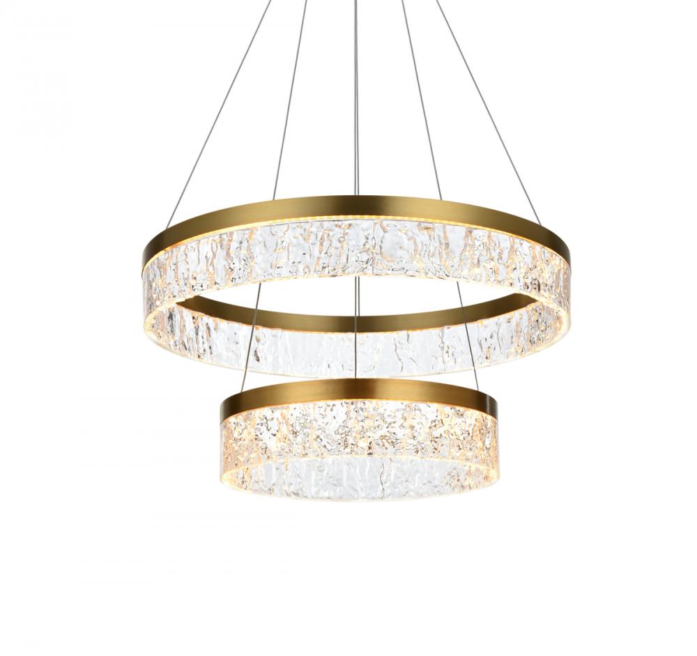 Illuminate your space with our 22-inch chandelier, showcasing a distinctive two-tier ring design that gracefully diffuses ambient light through captivating ripple-cut crystal elements, adding a touch of modern elegance to your surroundings.