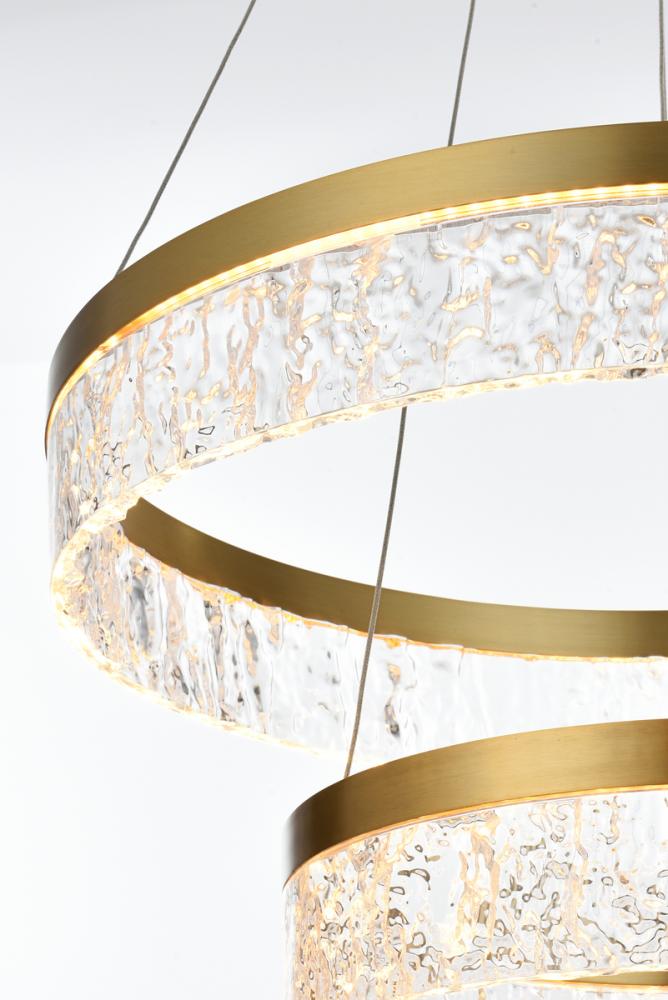 Illuminate your space with the Linden 22 inch LED chandelier, featuring a distinctive two-tier ring design that gracefully diffuses ambient light through captivating ripple-cut elements, adding a touch of modern elegance to your surroundings. Enhance the contemporary allure with integrated LED lights, offering subtle and energy-efficient illumination. Crafted with precision, this chandelier combines a durable iron and aluminum frame with acrylic elements for longevity and modern sophistication. Rest easy with UL-listed certification, ensuring stringent safety standards. Illuminate your home with sophistication and efficiency, as the Linden chandelier effortlessly merges contemporary design with functional brilliance. with a simple flick, effortlessly transition between three distinct color temperatures—3000K for warm and cozy moments, 4500K for a balanced ambiance, and 6000K for a crisp, invigorating brightness. This innovative toggle switch empowers you to set the mood and adapt the lighting to suit various occasions. Whether you seek a relaxed evening glow, a neutral and focused atmosphere, or a vibrant and energizing radiance, our chandelier provides the flexibility to cater to your preferences.