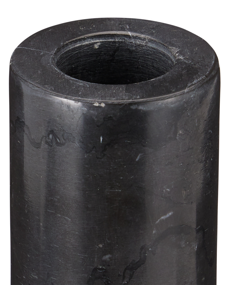 The Lithos Black Candle Holder Set includes two candle holders made of black marquina marble. The geometric shapes that comprise its profile are enlivened by the natural veining of the stone, making each one unique. The characteristics of this stone bring a deep black and crisp white interplay to their surfaces.