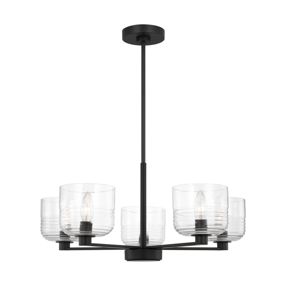 Crafted with Steel in a Midnight Black finish with clear ribbed glass shades