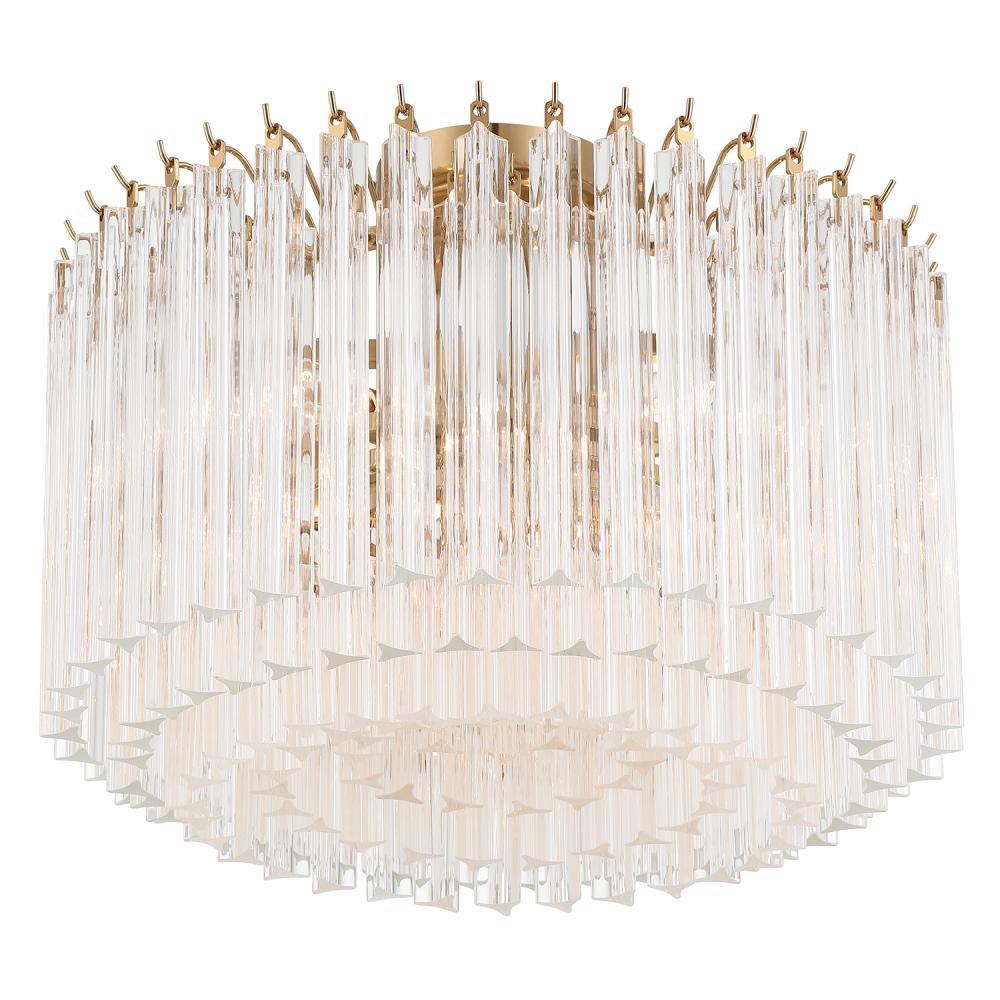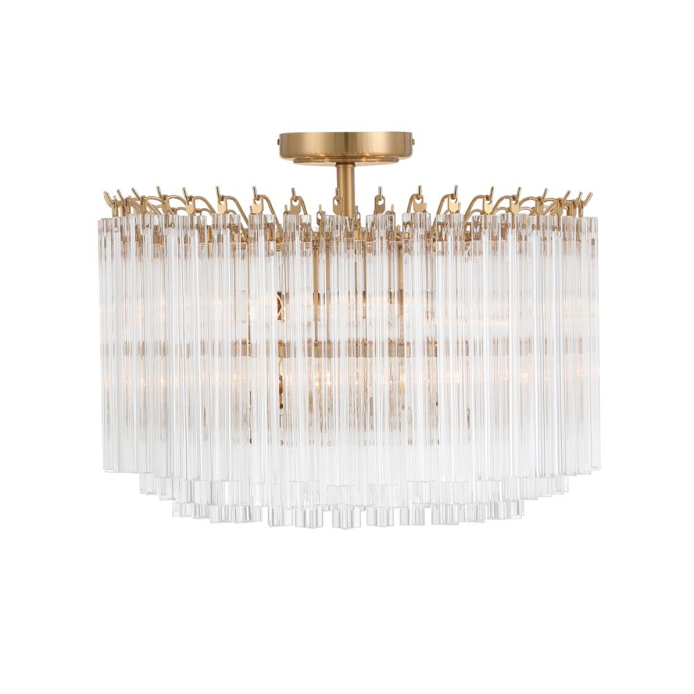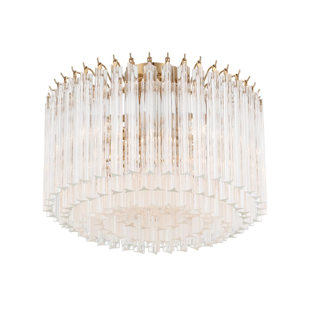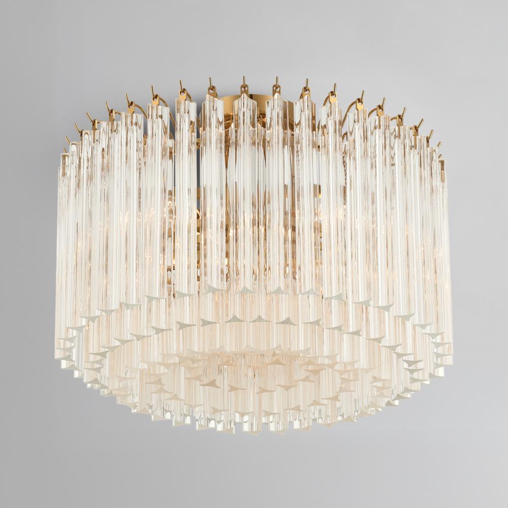 The Lofton Collection showcases mid-century sophistication with its stepped, tiered design and distinctive Triedri glass rods. Created using a technique that involves making triangular cuts on the glass, the Triedri method results in a faceted, crystal-like appearance that enhances sparkle and depth. The glass gracefully cascades downward and inward, framed in polished nickel or aged brass. This dynamic design ensures that the Lofton Collection remains a luxurious and visually striking centerpiece, with its facets reflecting light in captivating ways from any angle.