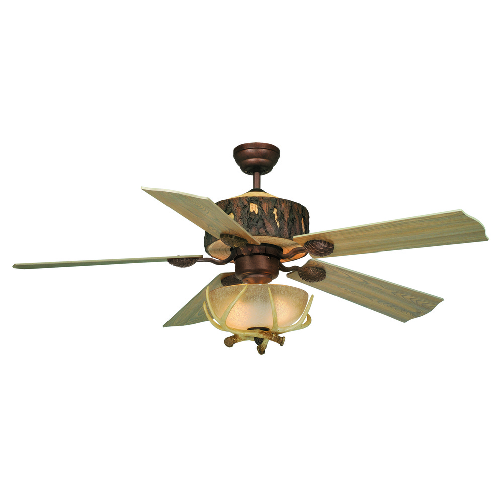 This rustic cabin inspired ceiling fan features a tree trunk like motor housing and a weathered bronze finish. Add a light kit (sold separately) to brighten up your space. This fan is compatible with sloped ceilings and includes a 6 inch down rod (longer down rods sold separately). Blades are reversible; choose between washed oak or pine.