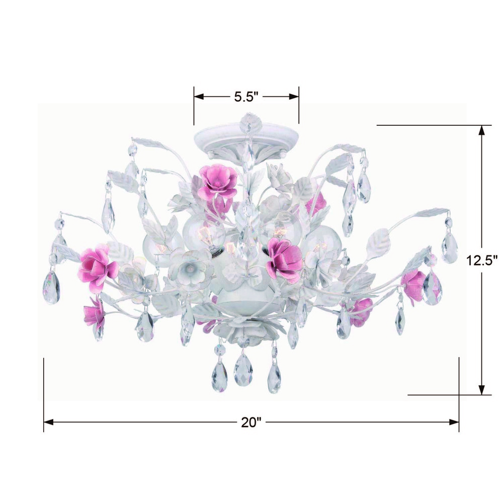 The Lola features a feminine, yet casual fixture. Inspired by the Paris Market, Le Puces de Paris Saint-Ouen, which features antiques and vintage treasures, Lola's softly curved white frame, highlighted with pink colored flowers, is adorned with sparkling faceted crystal jewels. The scale and design of this light makes it the perfect lighting for a little girl's room, but would work great with any space that needs a bit of a chic elegant accent.