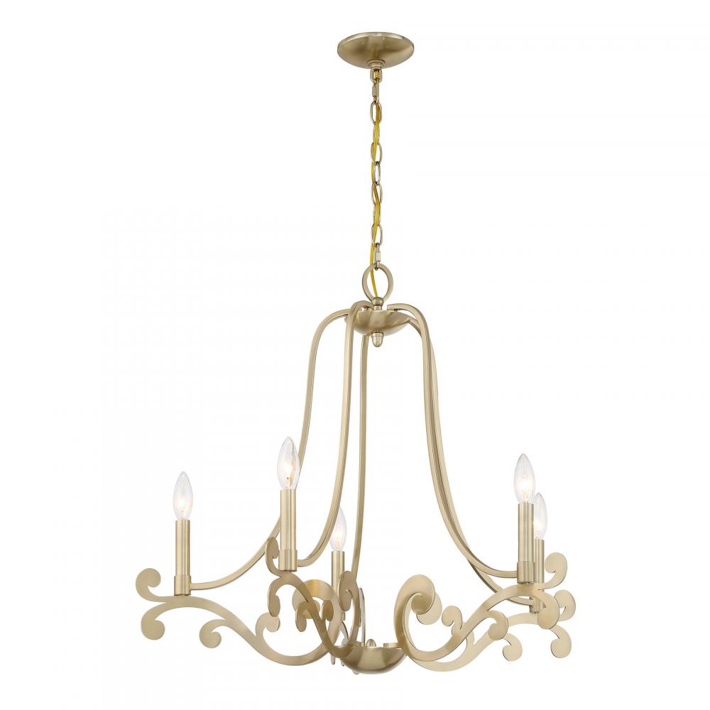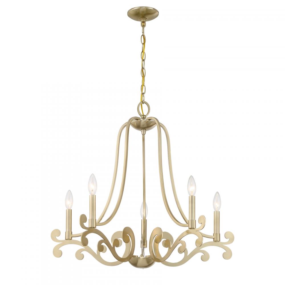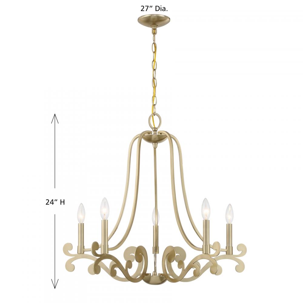 The Savoy House Lombard 5-light chandelier has a delicate, ethereal look with curling, twirling flourishes and a Noble Brass finish. It is a perfect way to add elegant illumination to any room! Lombard is 24" in height and 27" in width. Uses five candelabra size bulbs of up to 60 watts per bulb. Bulbs not included. Comes with 120" of chain.