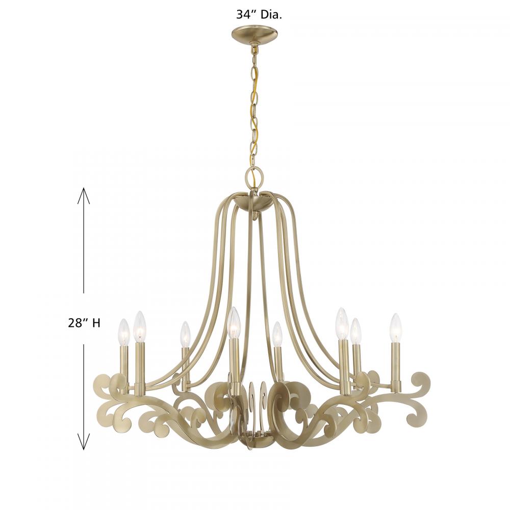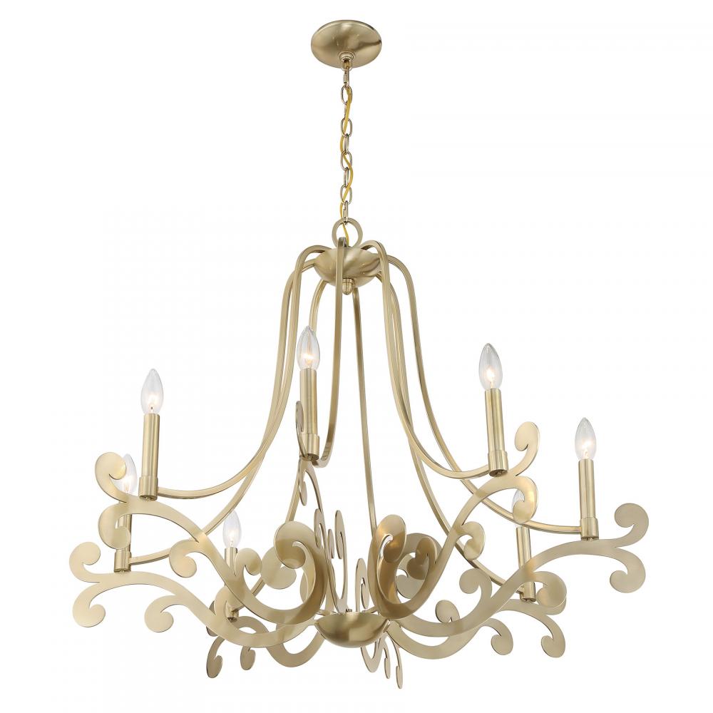 The Savoy House Lombard 8-light chandelier has a delicate, ethereal look with curling, twirling flourishes and a Noble Brass finish. It is a perfect way to add elegant illumination to any room! Lombard is 28" in height and 34" in width. Uses eight candelabra size bulbs of up to 60 watts per bulb. Bulbs not included. Comes with 120" of chain.