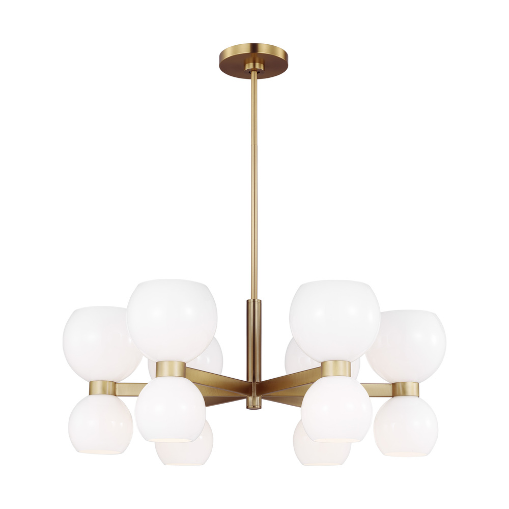 Londyn is inspired by geometric playful midcentury fixtures in metal and glass with exciting profiles and scale play. Rectangle stock metal rods and a playful layout of blown glass globes in two sizes with elegant metal cuffs create visual interest. This chandelier would be great above a dining table or casual island/nook.